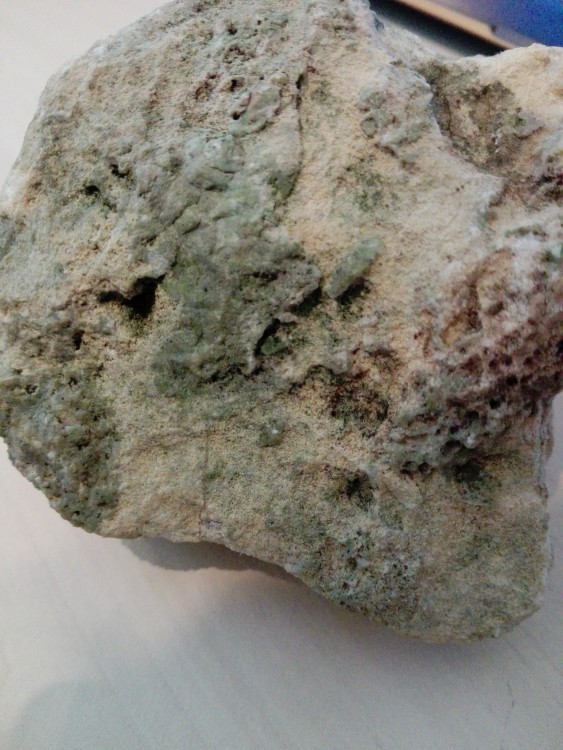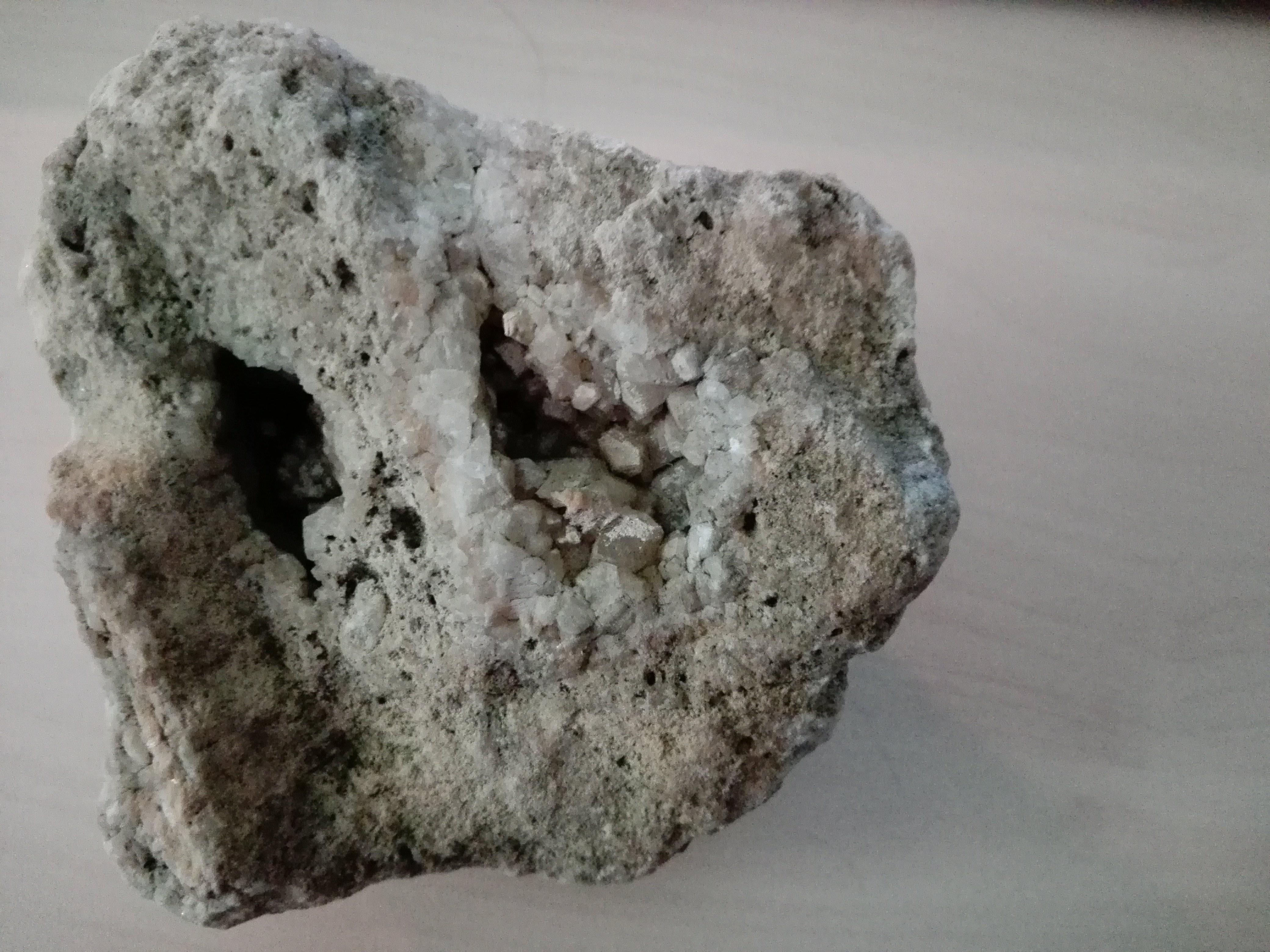 J'ai également ramassé une deuxième pierre, au bord d'un chemin au bord d'une falaise menant au lieu dit "tête d'henri IV", toujours à Moirans-En-Montagne, et j'aimerais pouvoir identifier les cristaux présents à l'intérieur (de couleur blanche aux extrémités er rosée aux bases) ainsi que l'extérieur de la pierre, particulièrement aux endroits où elle est verdâtre… (le vert se trouve, en majorité, à l'extérieur de la pierre).