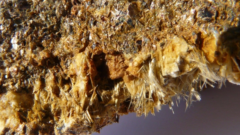 Toujours dans le meme filonnet, il y avait un minéral fibreux qui, enfin je pense, est encore différent du minéral ressemblant à l'épidote ....quelques photos :
