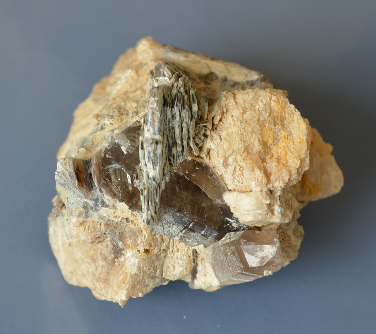 Quartz fumé, muscovite et feldspath (microcline ?) / Plus grand cristal 8cm