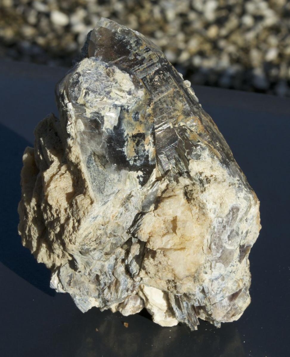 Par contre, si les « ingrédients de la recette » sont en nombre limité (quartz, albite, orthose, muscovite, schorl) c’est impressionnant comme la proportion des différents éléments peut varier d’une pegmatite à l’autre. En 1995, j’étais tombé sur une poche presque exclusivement composée de tourmaline …. A la découverte cela a été impressionnant ….. mais au final décevant : les pièces ne tenaient pas, les cristaux étaient enchevêtrés d’ou pas ou peu de terminaisons. Une petite photo d’une pièce (un vrai morceau de charbon lol) issue de cette trouvaille