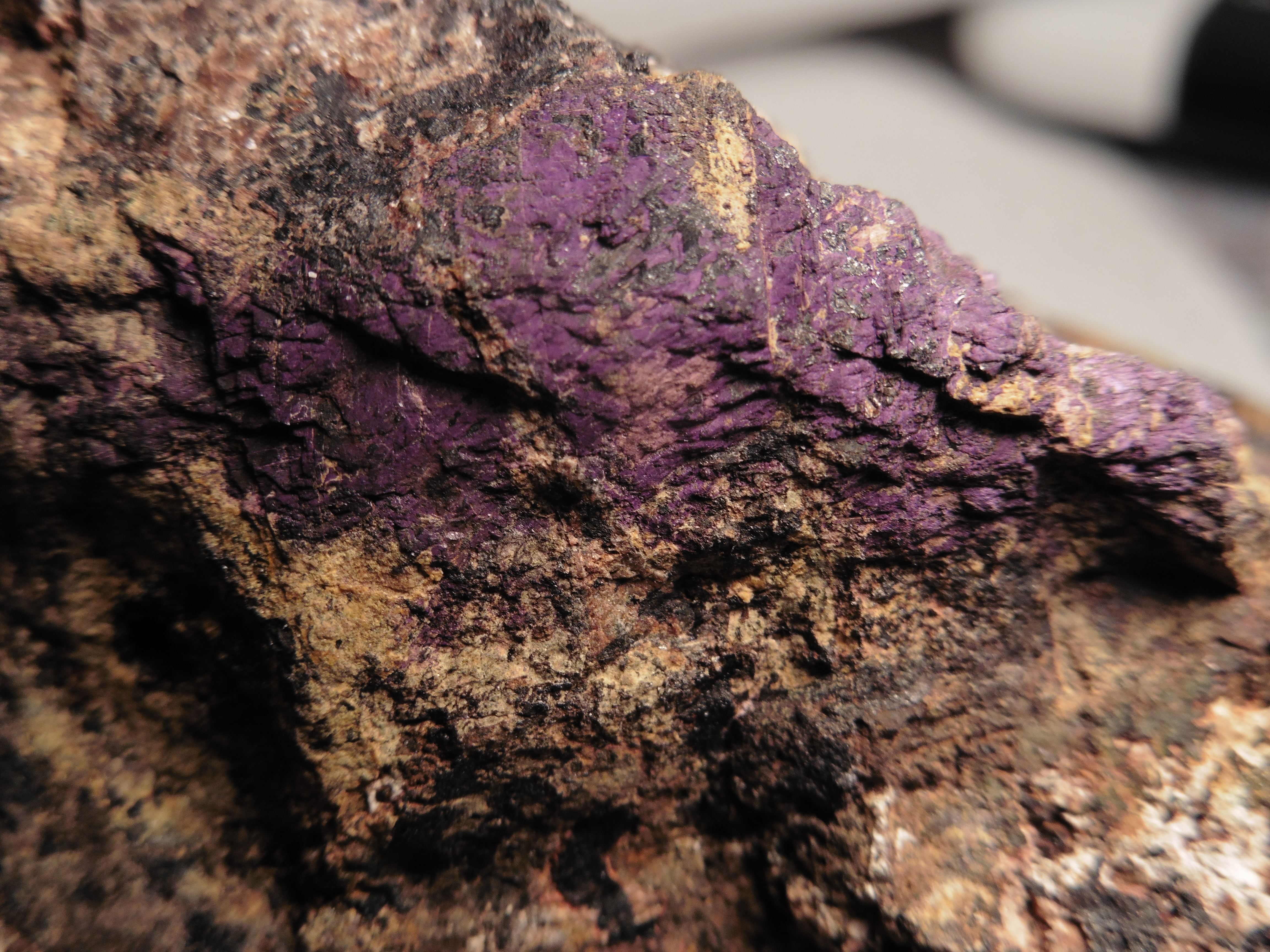Lentille pegmatitique en place (avec fluorine violette, un classique du site), champ de 20cm.