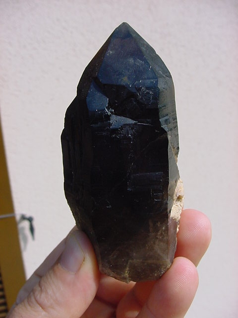 Quartz morion biterminé de 30 cm de long trouvé dans les souches d’un arbre après la tempête de 1999 dans les bois de Vénachat. Malheureusement il n’est pas bien terminé au deux extrémités….