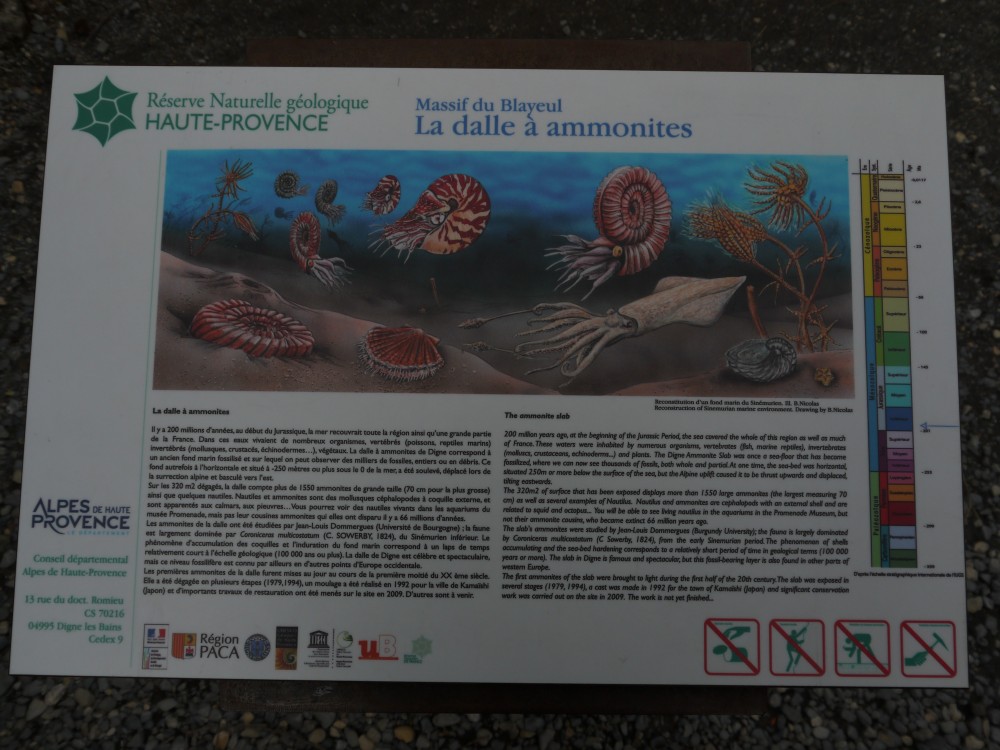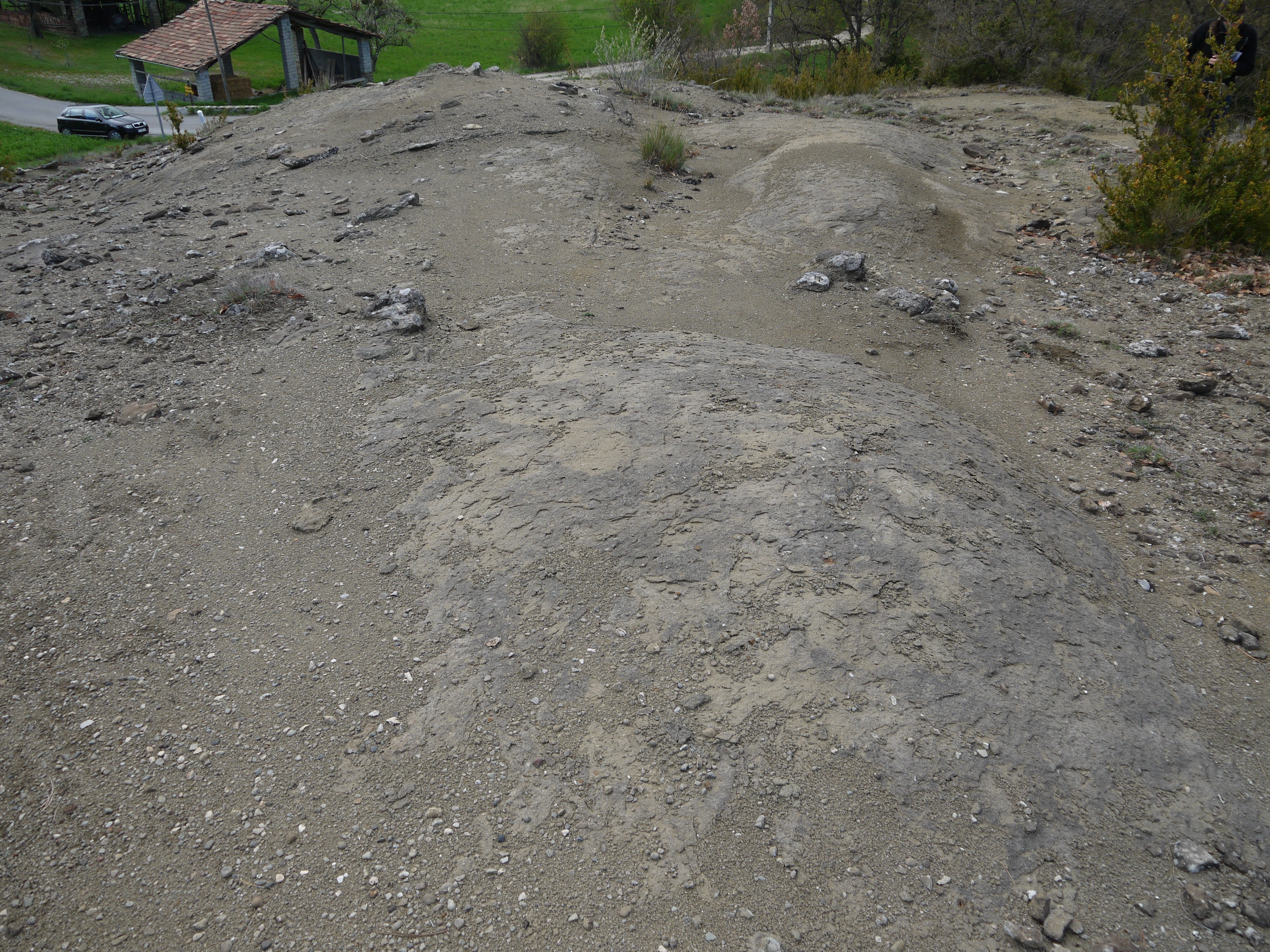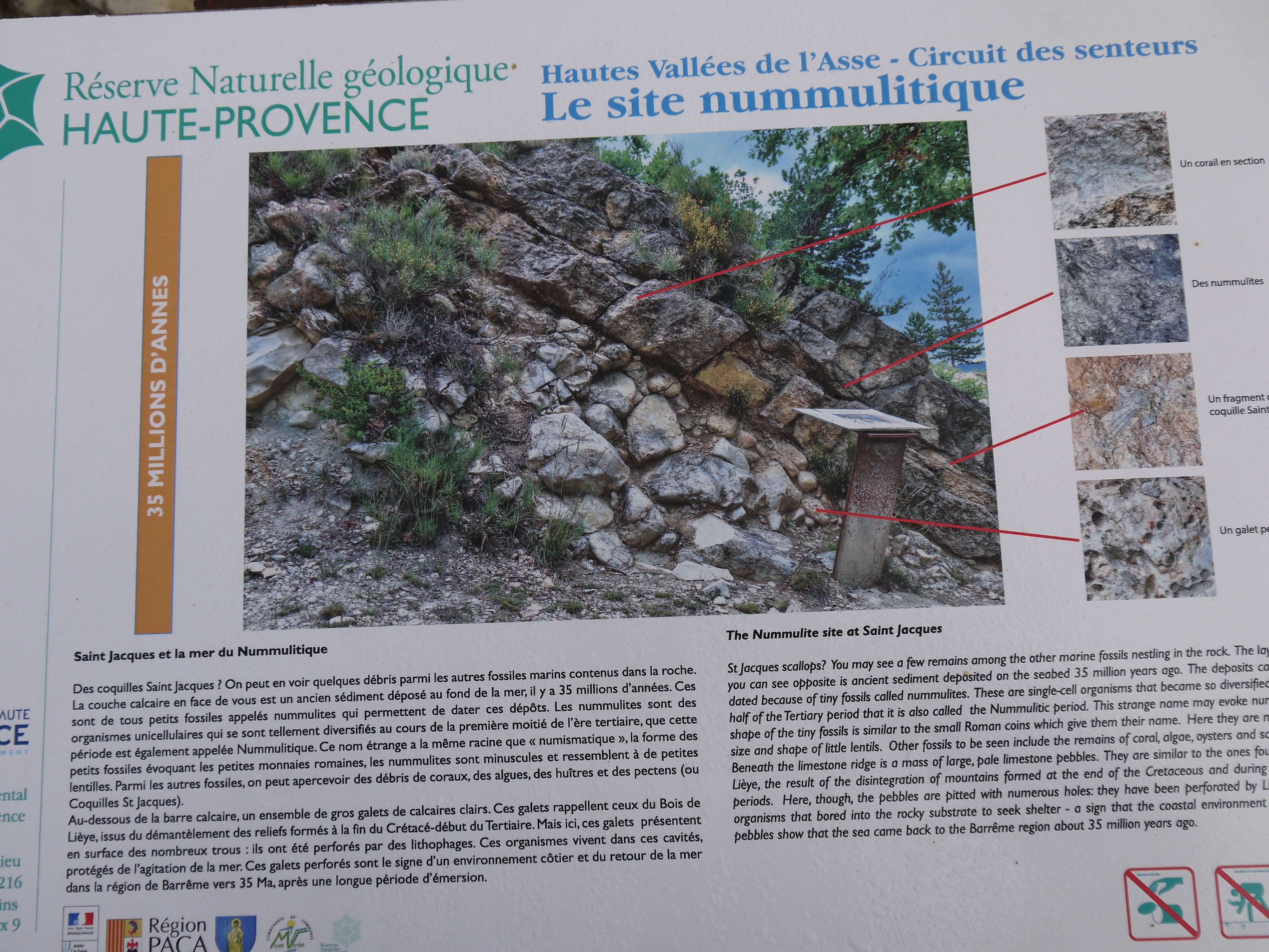 Et le panneau explicatif de ces coulées volcano-détritiques (rares traces de volcanisme du département 04). Elles sont situées dans la vallée perdue ... (peu d'entretien des sites dans ce coin là !) de l'Asse près du lieu-dit La Poste :-) d'où la super qualité du panneau <_<