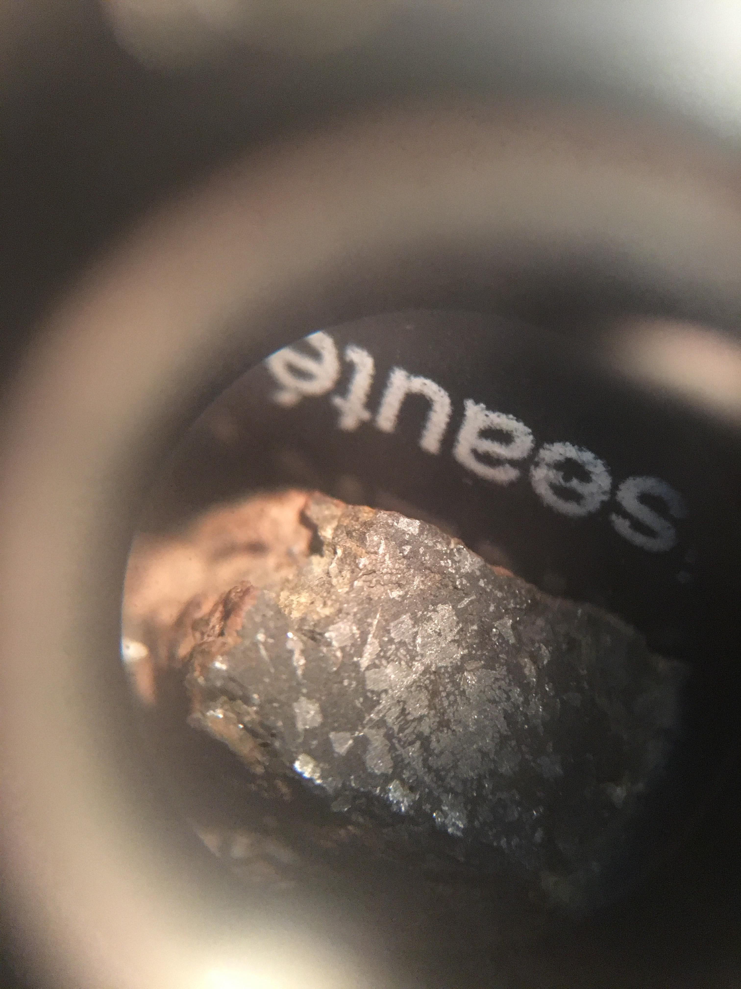 il y a trois jours, alors que je passait un labour au détecteur, je suis tombé sur une petite pierre qui sonnait presque a max en discri, à première vu, en frottant un peu y'avais des petits cristaux visible en surface.. je rentre, je la nettoie, je la passe a coté d'une boussole, rien... j'approche un aimant, rien.. en la grattant un peu trop fort j'ai un peu abîmé un coté, j'en ai donc profité pour limer a plat cette partie, c'étais vachement mou, ma lime mordait dedans comme dans de l'acier. et à l'intérieur y'a des petits cristaux d'un demi millimètre, carrés presque parfait, et des sortes d'aiguilles, en métal, dans une masse noire (vue de près à la loupe)