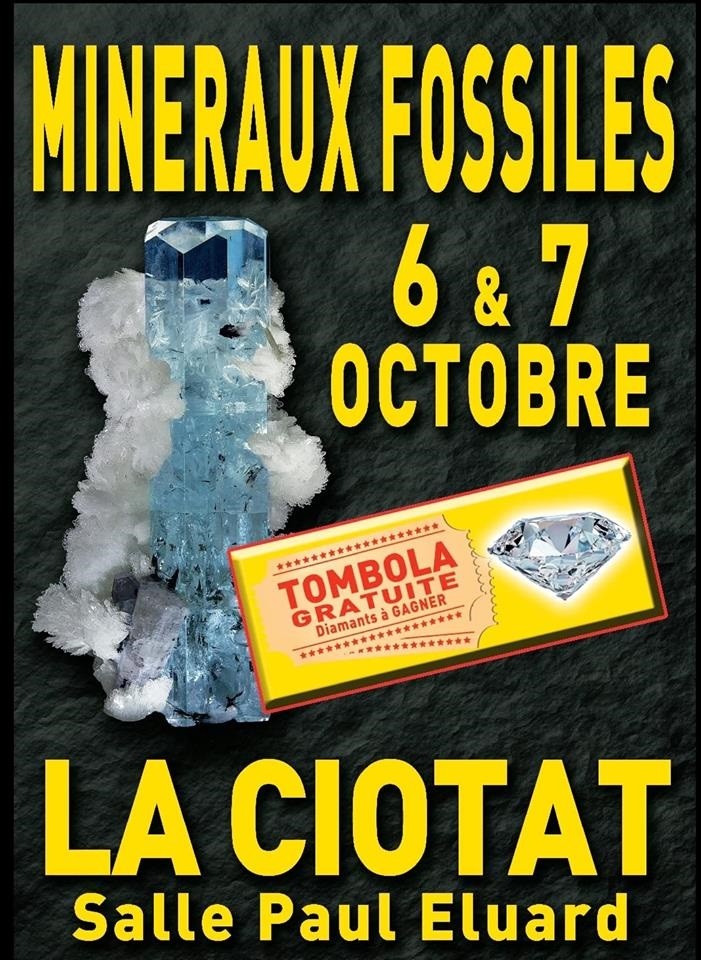 Cette année, 40 exposants seront présents Samedi 6 et Dimanche 7 Octobre 2018 de 10h à 18h à la Salle Paul Eluard (Avenue Jules Ferry à La Ciotat) et proposeront à la vente de petits et grands fossiles, minéraux bruts ou travaillés en lampes et objets de décoration, météorites, bijoux et pierres précieuses.