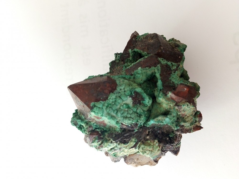 Quartz, avec plein d'oxydes de fer, une belle couleur marron avec malachite très verte et deux petites pétales d'azurite au verso, Maroc