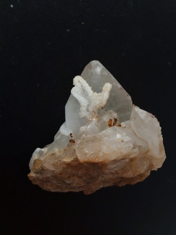 1e génération de quartz laiteux, sceptre avec inclusions de pyrite limonitisée et hématite.  qui se trouvent entre le quartz est son sceptre en général, mais se retrouve dans les deux