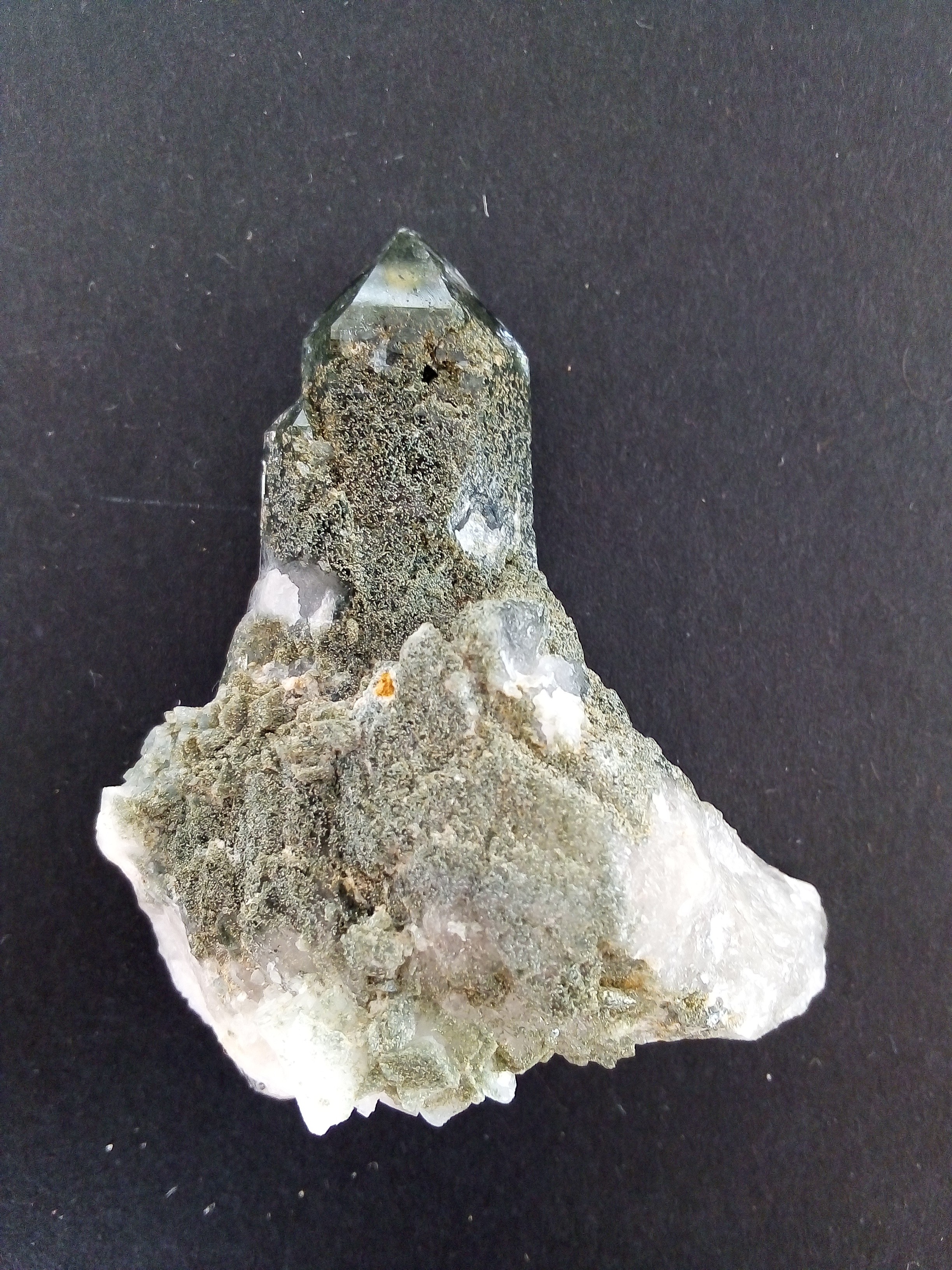 Je me souviens aussi que cette fois j'étais tombé sur une veine avec quartz chloriteux exploitée juste avant que j'arrive, frais de la veille grand max.. et je voyais les déchets, les morceaux de quartz jetés.. je me disais ''aaaaah mais pourquoi''.. bon maintenant je passe à côté je ne m'arrête pas forcément... les cristaux mesuraient 2 cm x)