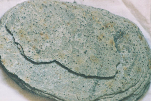 Je ne sais pas ce que c'est c'est juste une roche verte 'un peu terreuse' avec des petites enclaves vert foncé... mais c'est pas l son intérèt, c'est pour le travail du gel et du dégel dessus ( découpage en lamelles ) que je l'ai prise.