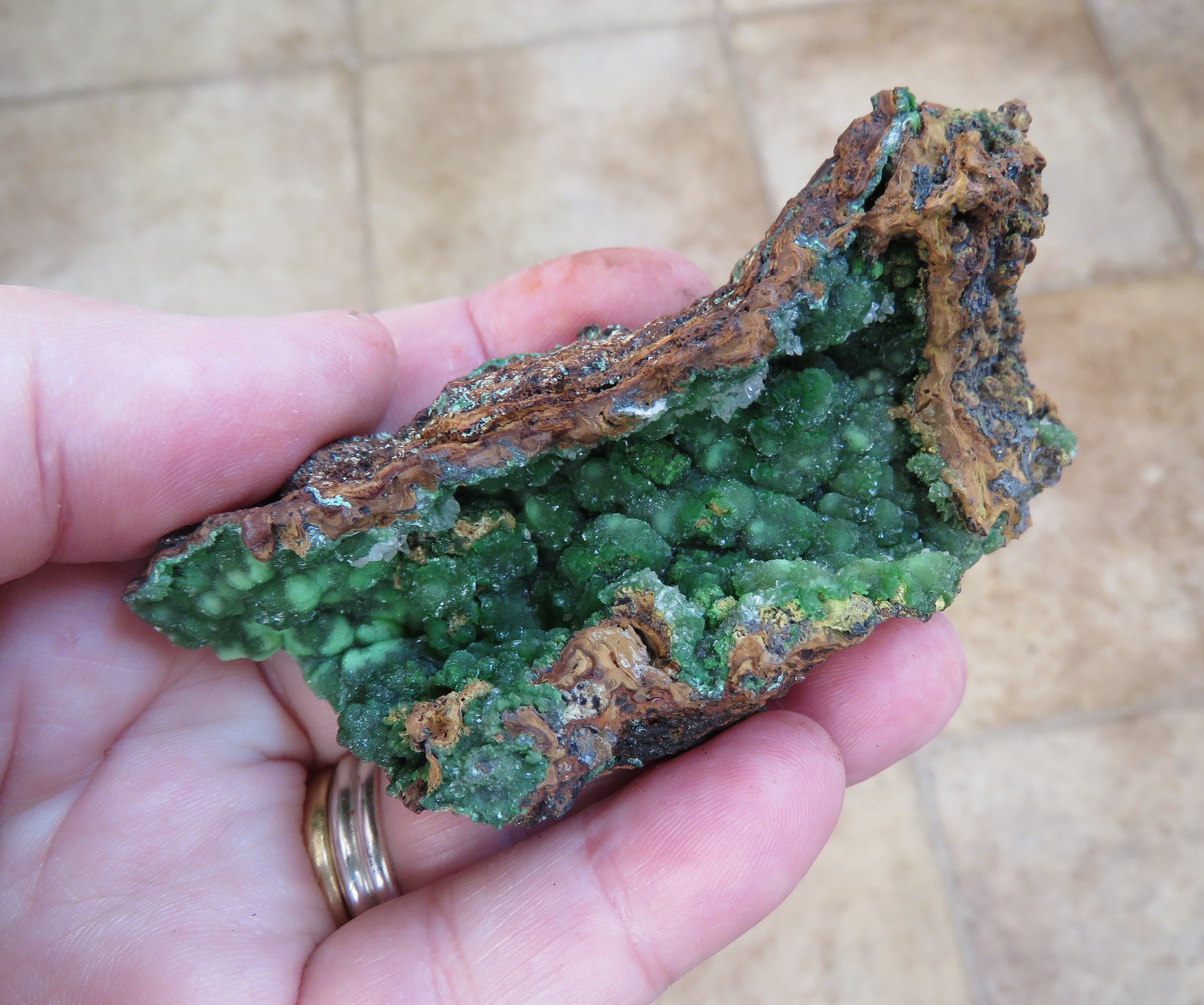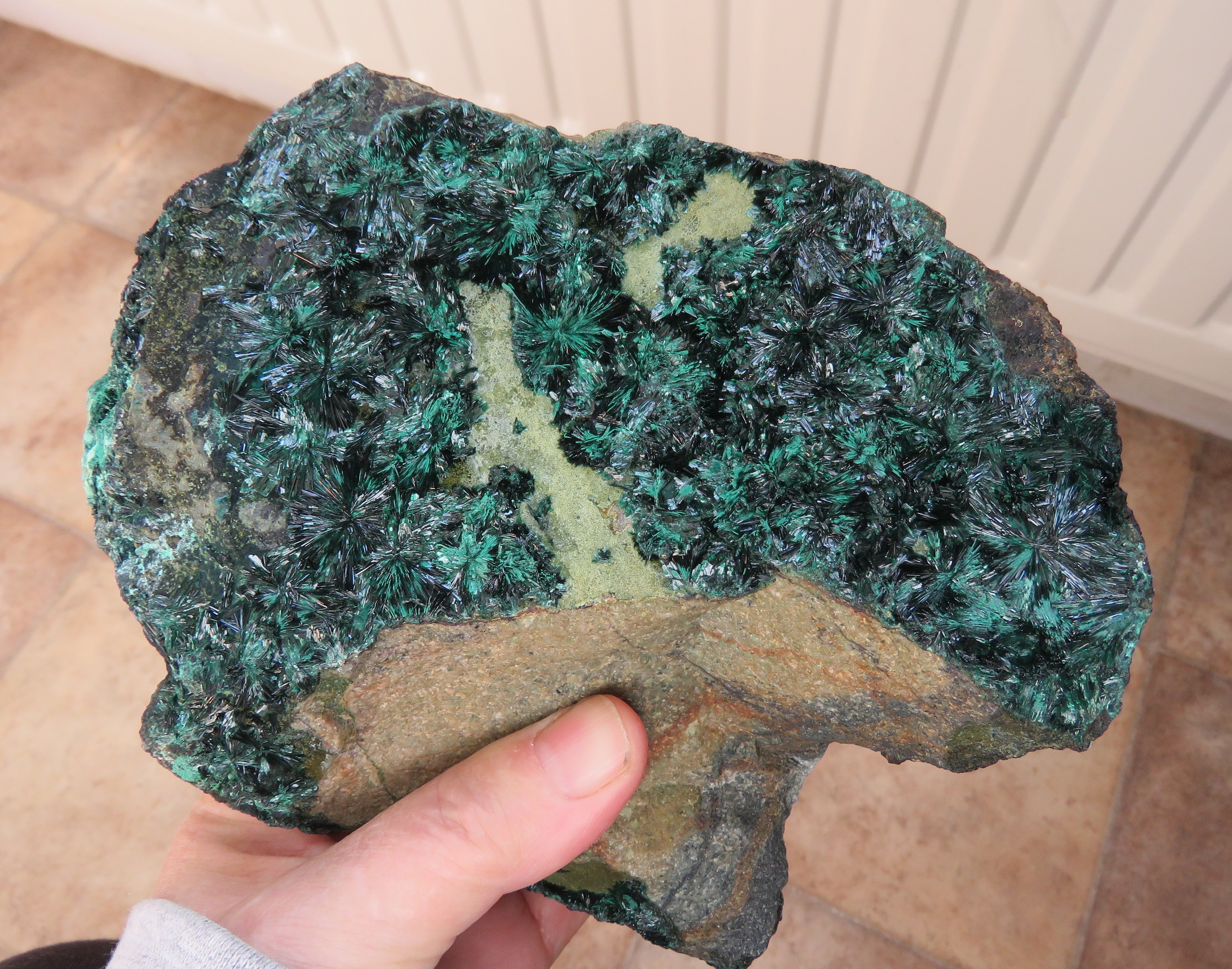 Et je termine ce soir sur un minéral que j'apprécie vraiment beaucoup à l'état brut ou taillé (peut-être mon prochain sujet sur Géof') : malachite, en amas d'aiguilles, Midingi, Katanga, RDC