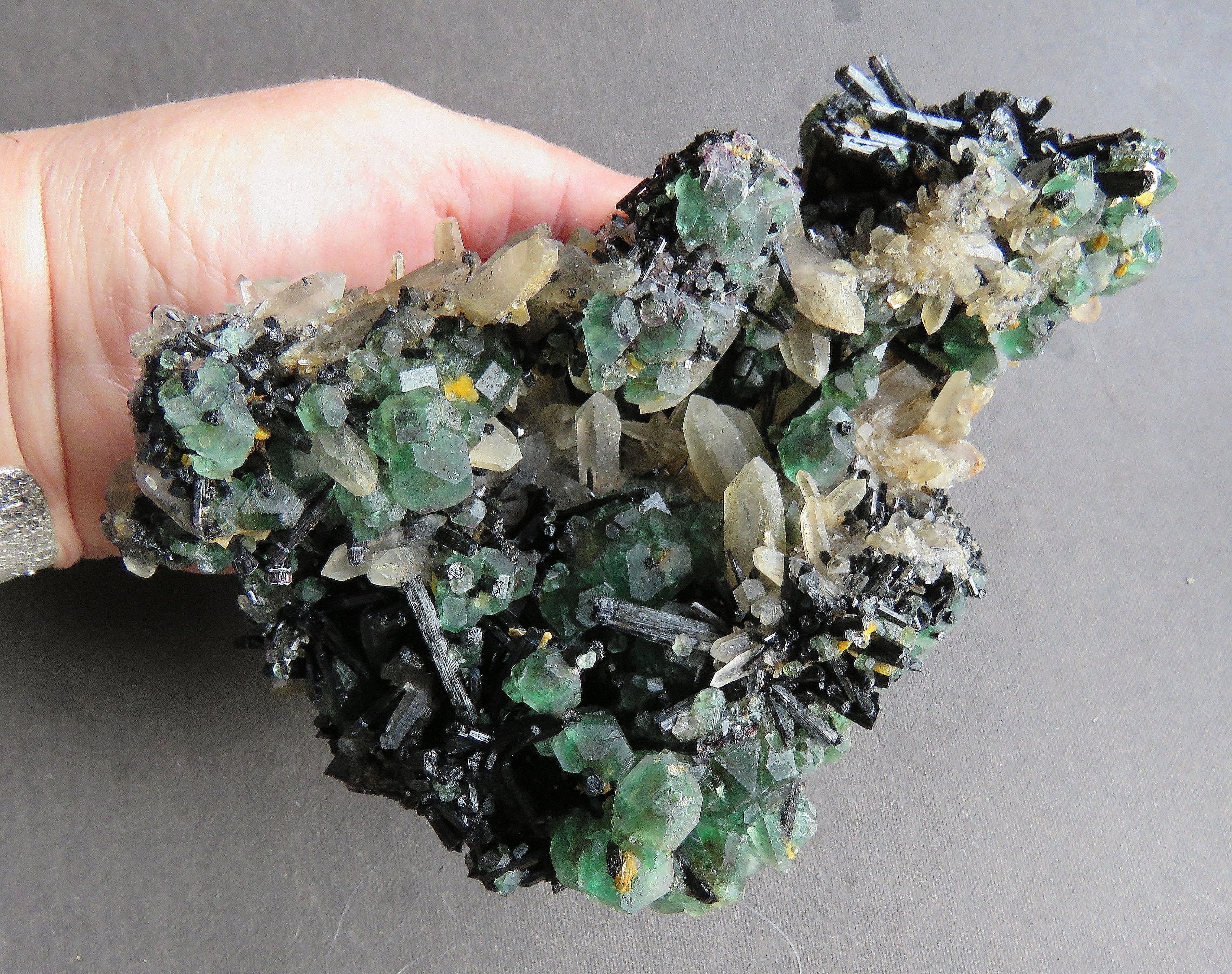 Du vert de Namibie: fluorine cuboctaédrique verte avec quartz , muscovite (jaune) et schorl/foitite bleu violacé :