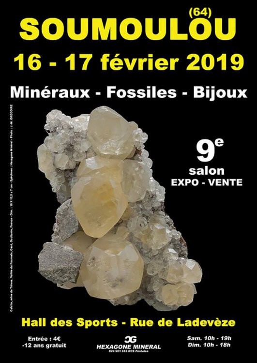 "NOTRE PROCHAIN SALON se déroulera à SOUMOULOU (64) ! Pour cette 9e édition, nous présenterons une exposition de prestige consacrée aux patrimoine minéralogique des Pyrénées-Atlantiques ! Les collectionneurs pourront découvrir des spécimens esthétiques provenant de localités classiques ou plus confidentielles. Amis exposants, ne tardez pas à vous inscrire car les places sont limitées ! A très bientôt ! "
