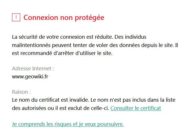 Comme on le voit, sur les trois navigateur, le site geowiki n'est pas en https. L'antivirus peut donc empêcher d'y accéder.
