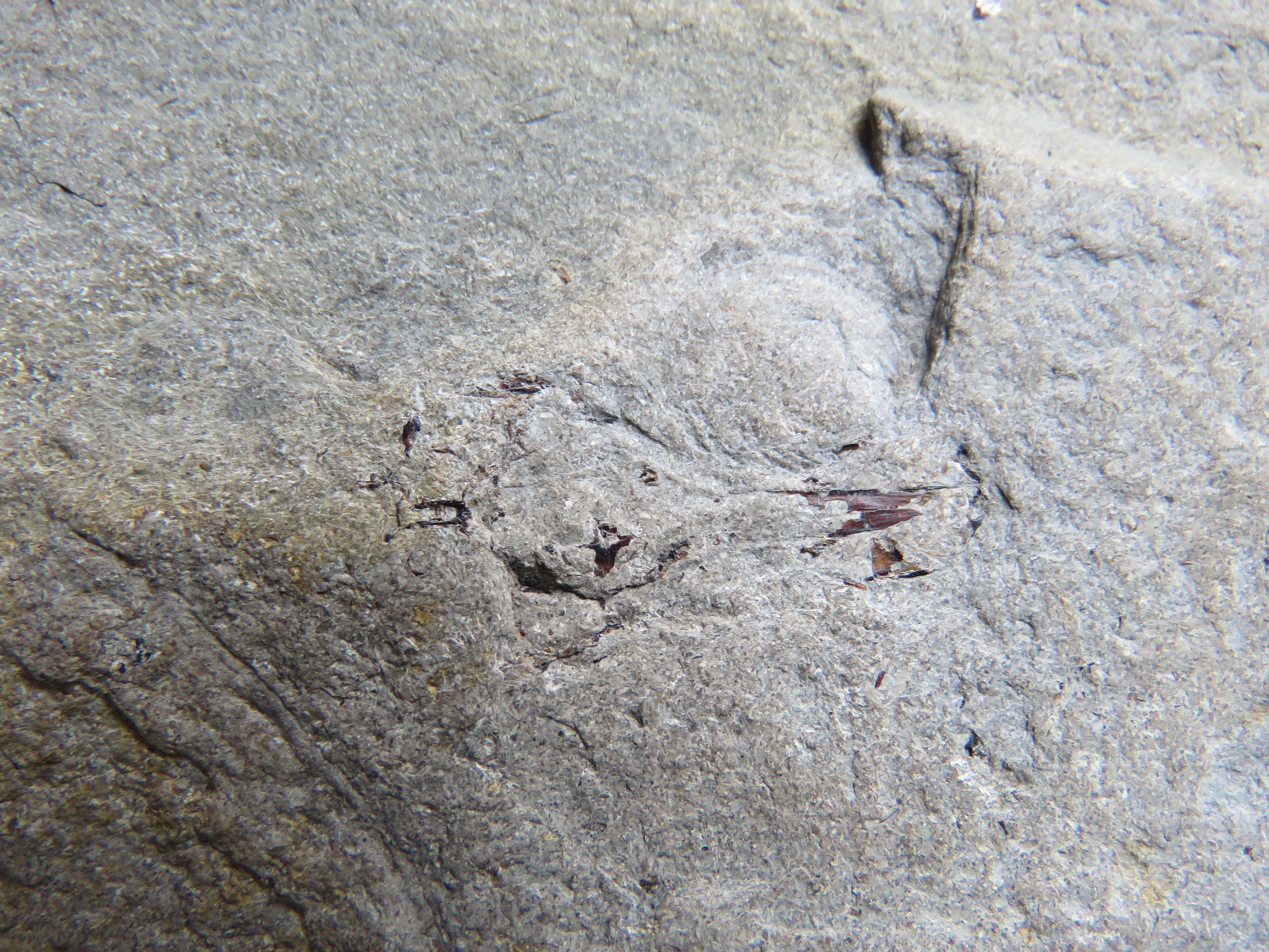 Le fossile est tel que dégagé naturellement sur le schiste-carton. Les parties brun-rouge un peu translucides peuvent rappeler l'aspect des os des poissons du Toarcien basal, quelques mètres plus bas, mais ces derniers sont dans du calcaire bitumineux dur. Je n'ai guère d'idée de ce dont il s'agit... sinon possiblement un crâne de poisson vu d'en-dessous ? Quels seraient vos avis ? Cela mesure 33 mm de long, soit une bien plus grande taille que les crânes de poissons type leptolepis. En vous remerciant pour votre aide !