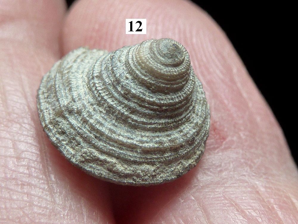 Toujours dans le Toarcien: 12 le petit avec le pseudotest bien conservé et 13 le grand pyriteux. Je suppose que ce sont des Perotrochus subdecoratus ou Perotrochus repilinianus ou Perotrochus isarensis (je ne sais pas lequel des trois synonymes est actuellement valide)