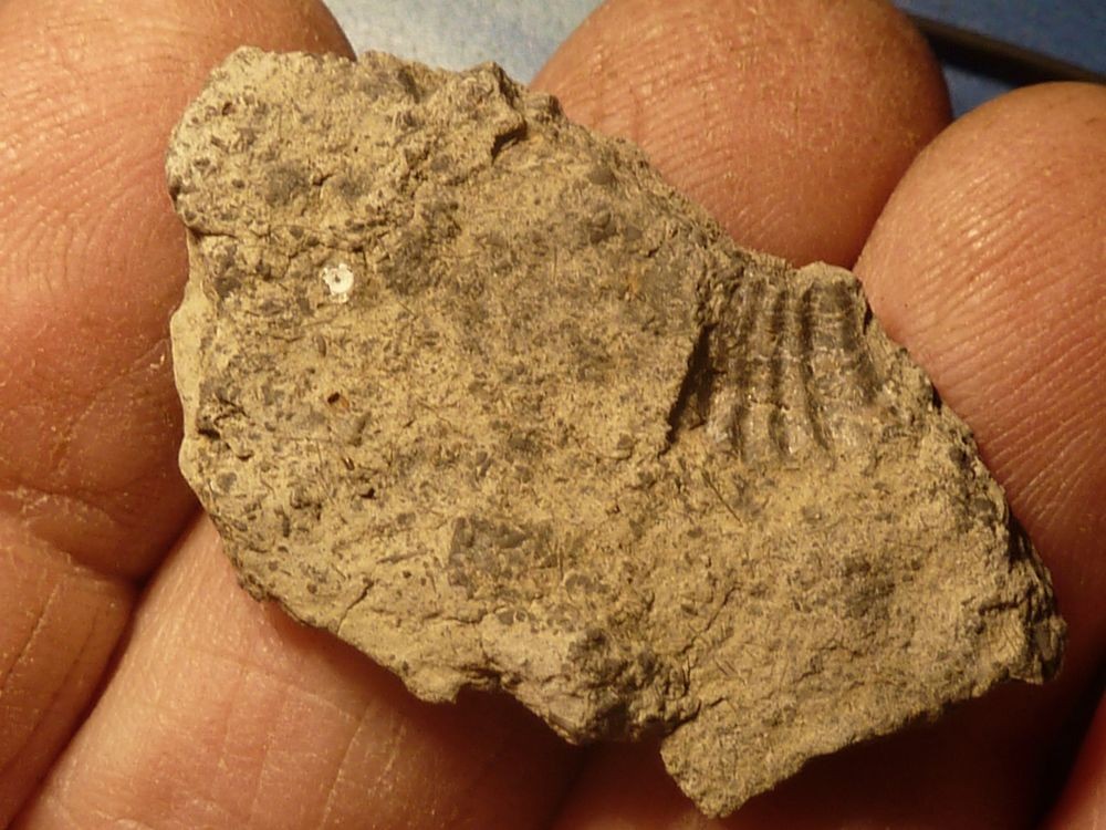 C'est à notre amie Chantal que revient l'honneur d'avoir mis au jour le premier indice de présence de ces formations lumachelliques dans le Domérien aveyronnais: sur deux fragments de lumachelle riche en débris de crinoïdes, une jolie petite dent de néosélacien sur l'un, et une vertèbre de poisson actinoptérygien sur l'autre.
