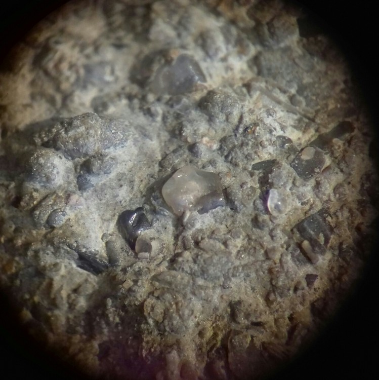 Les 5 lumachelles à dents qui contiennent ces cailloux de quartz ( 5 sur 22, un peu moins d'un quart) sont aussi les plus riches en dents et coquilles diverses. Le type de grains de quartz ne change que pour la L12:  grains plus gros, très arrondis, en quartz gris ou blanc majoritaire sur le quartz hyalin. La fréquence, elle, varie d'abondant (L 1) à assez fréquent (L3 et L20), avec L2 et L12 entre deux.