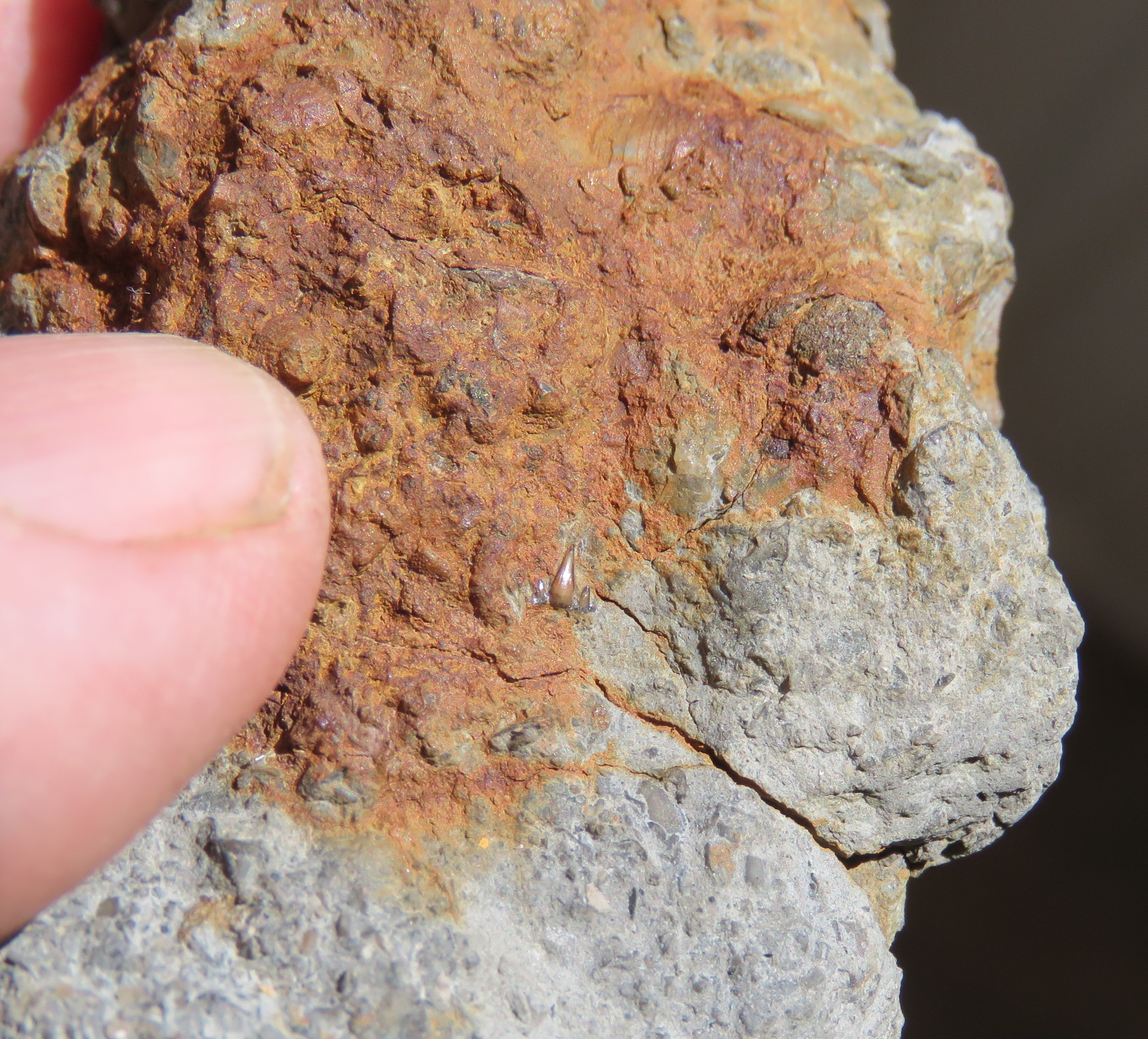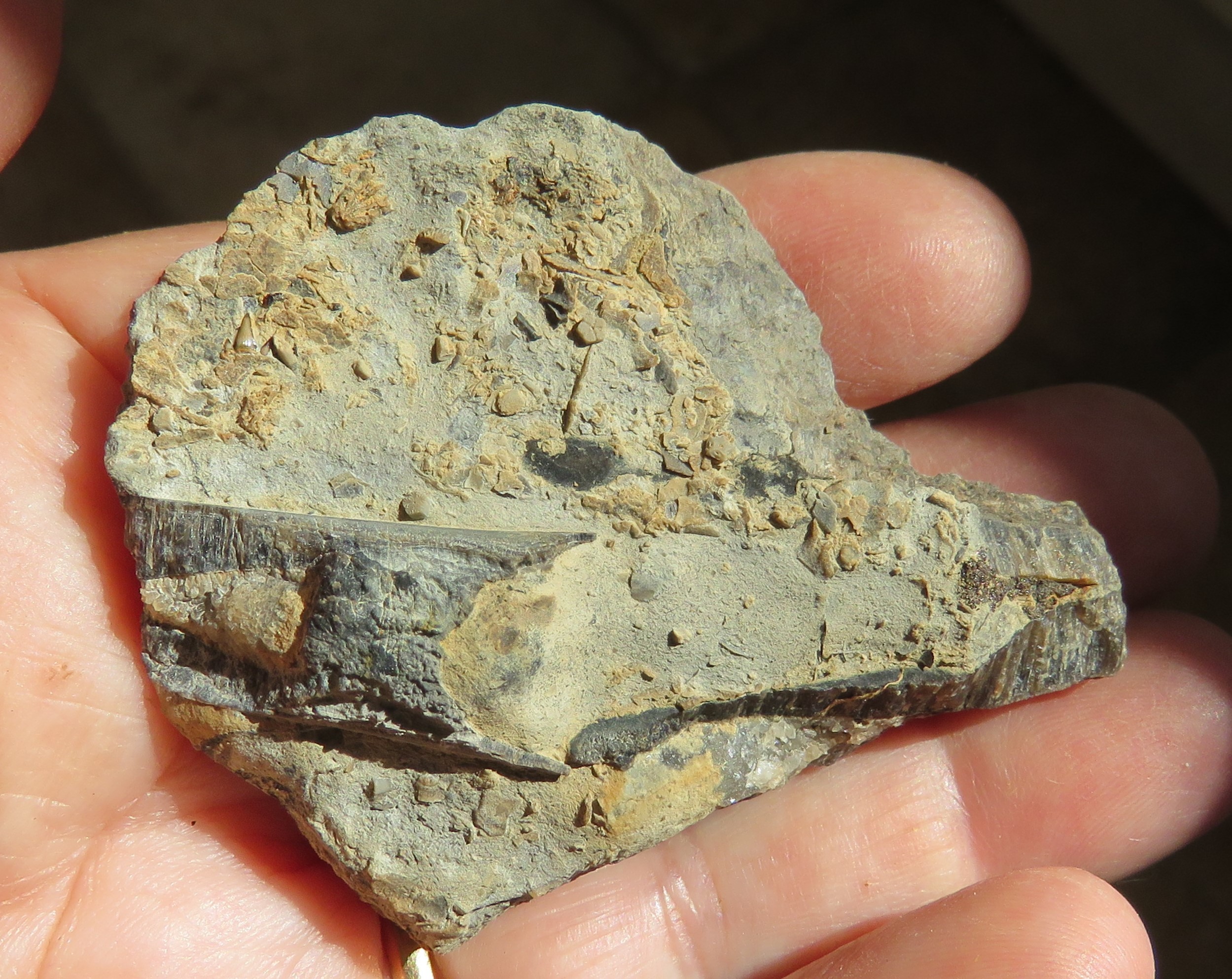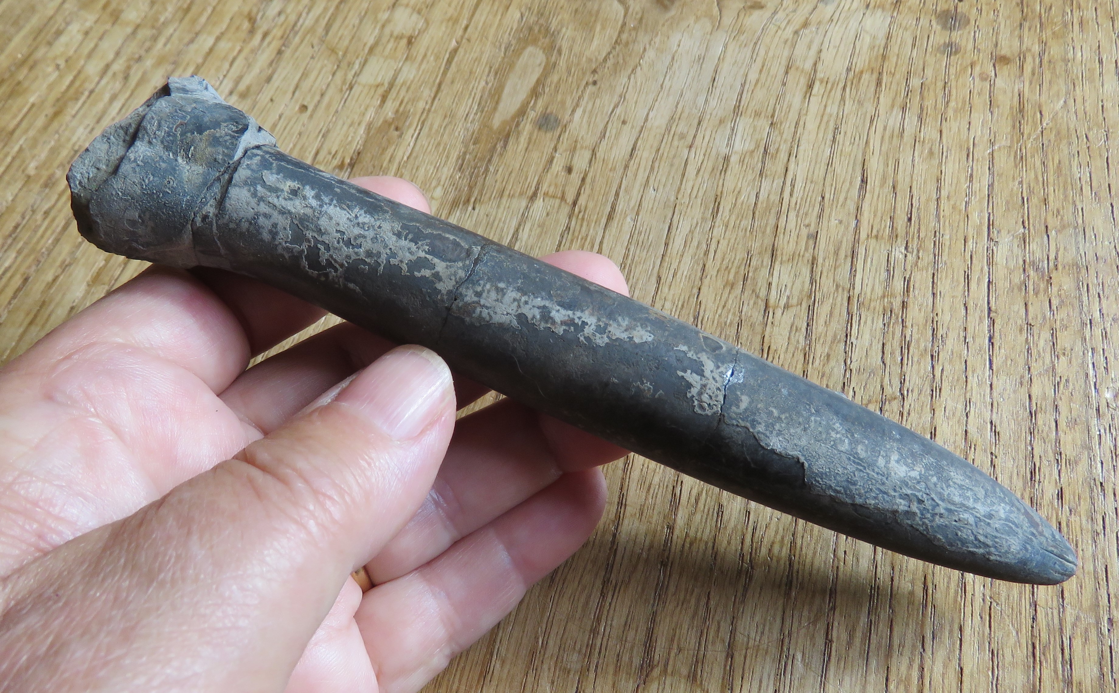 Trouvaille de ce jeudi, à l'affleurement dans une marne à la consistance d'argile de potier (donc bien météorisée), un grand et bel exemplaire de Passaloteuthis paxillosus, longueur 16.5 cm, Domérien supérieur, Lozère. La partie creuse du rostre était désagrégée dans la marne à cause de sa fragilité et la formation de cristaux de gypse à l'intérieur et dans les fissures. Elle a été partiellement emportée par le ruissellement. Un vrai puzzle incomplet, mais qui permet d'évaluer la longueur de ce rostre à 18 cm environ  s'il avait été entièrement préservé.