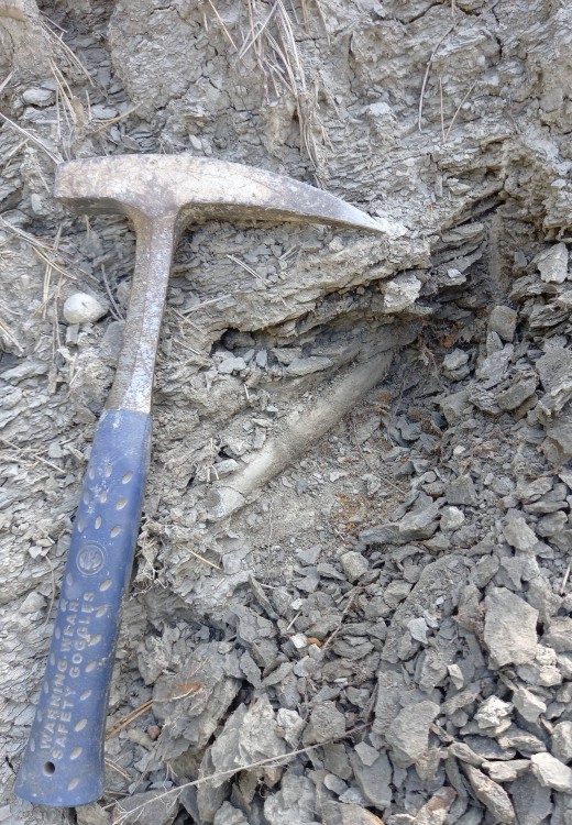Trouvaille de ce jeudi, à l'affleurement dans une marne à la consistance d'argile de potier (donc bien météorisée), un grand et bel exemplaire de Passaloteuthis paxillosus, longueur 16.5 cm, Domérien supérieur, Lozère. La partie creuse du rostre était désagrégée dans la marne à cause de sa fragilité et la formation de cristaux de gypse à l'intérieur et dans les fissures. Elle a été partiellement emportée par le ruissellement. Un vrai puzzle incomplet, mais qui permet d'évaluer la longueur de ce rostre à 18 cm environ  s'il avait été entièrement préservé.