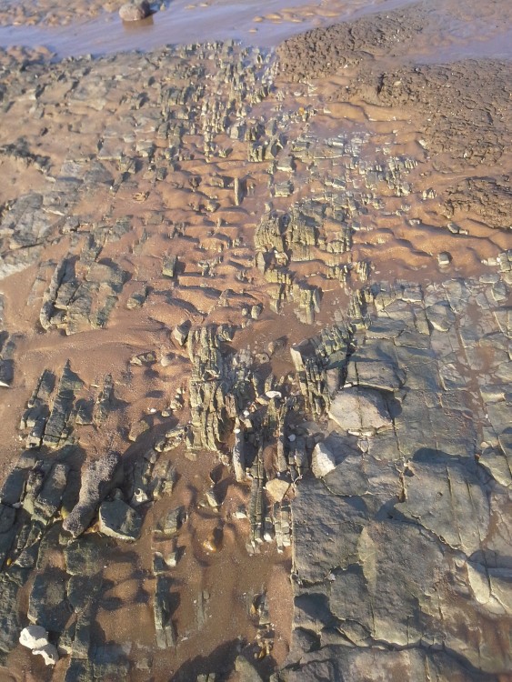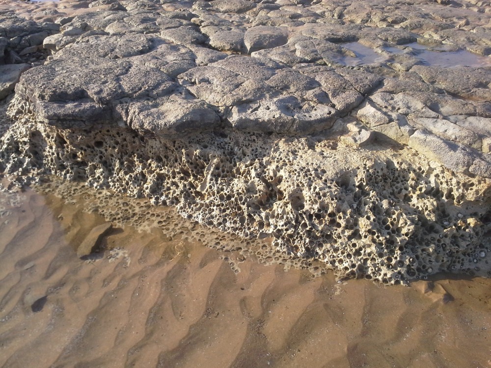 Les trous de pholade sont récents, modernes à partir d'un front dans un matériau plus tendre que celui de la dalle supérieure.