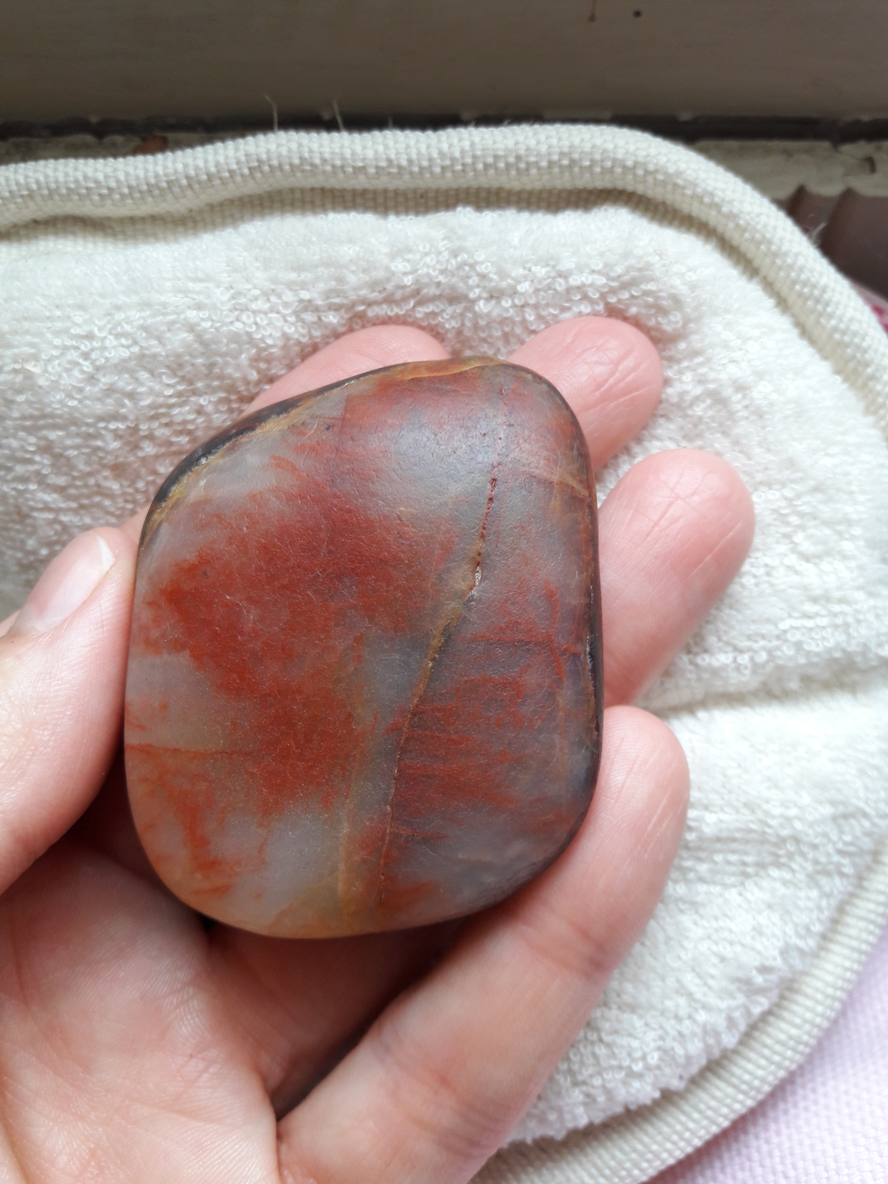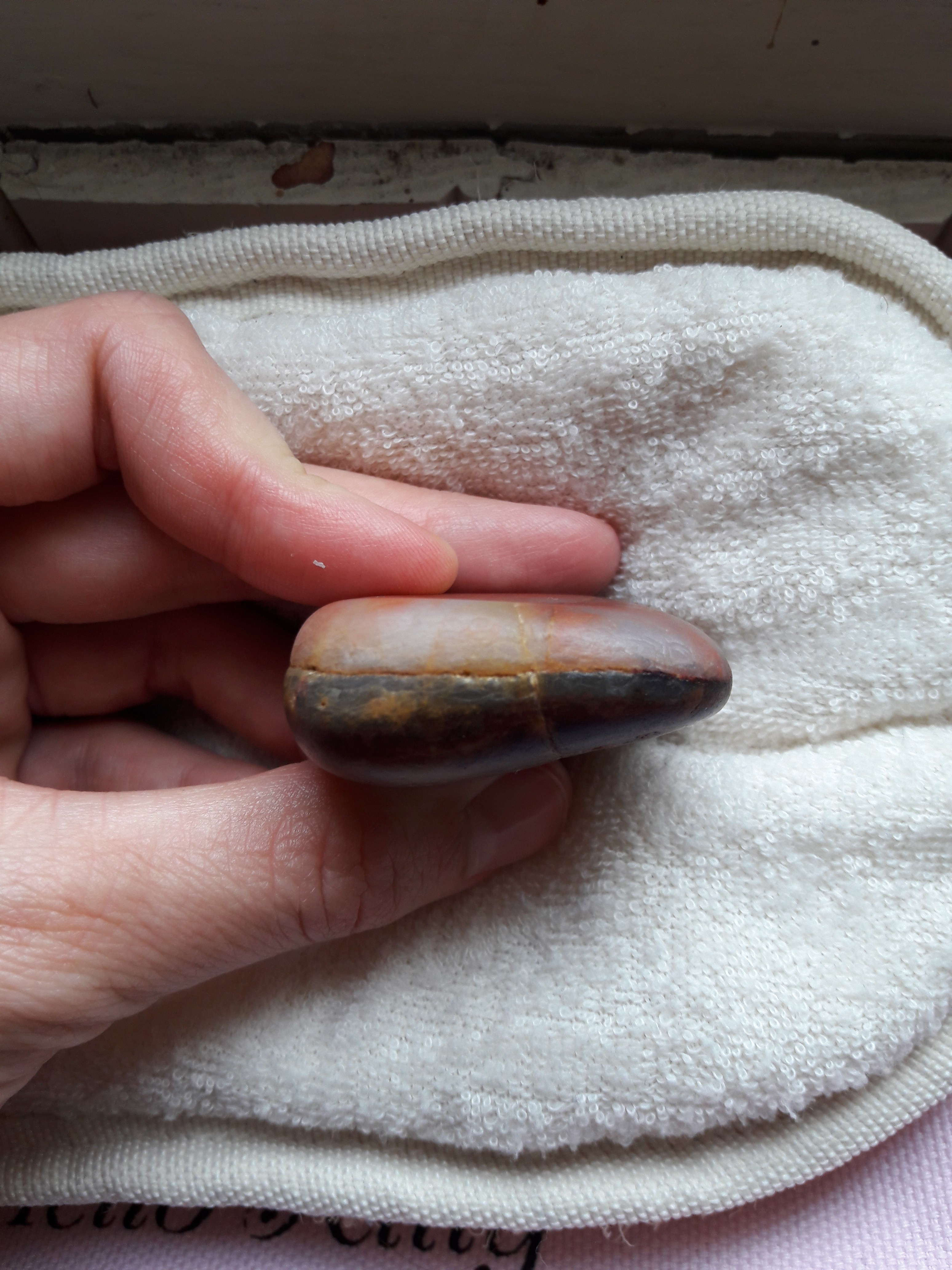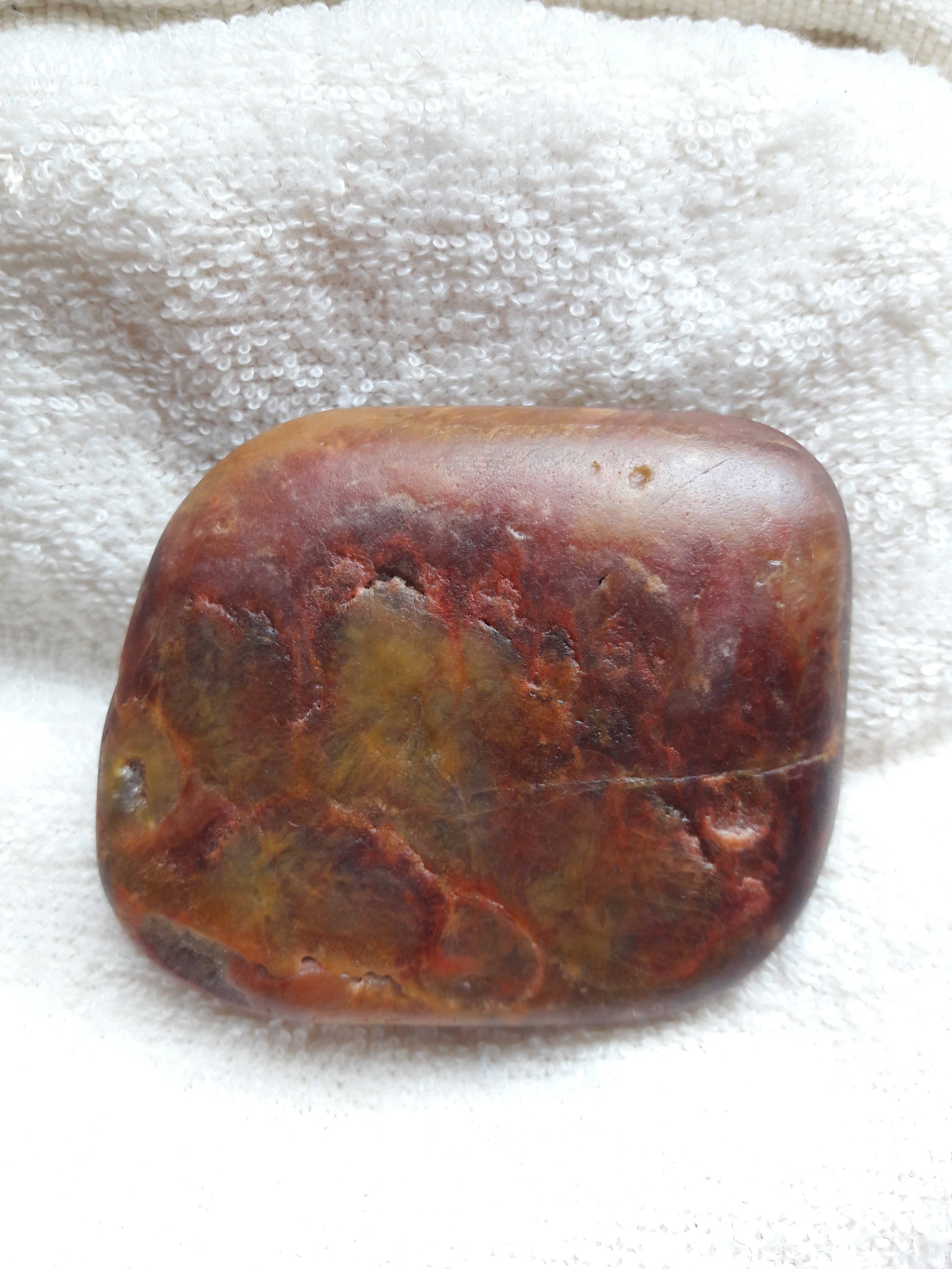 Bonjour, voici un galet trouvé sur une plage en gironde que j'aimerai bien que l'on m'aide à identifier : il présente deux couches différentes ; l'une translucide avec des veines rouges, qui font comme des effusions et l'autre côté est opaque, ocre avec des marbrures brun- rouge. L'ensemble dégage une forte odeur de fer. Certainement des oxydes de fer donc, mais dans quelle base? Merci pour vos éclairages