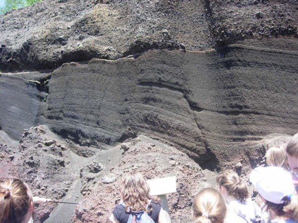 Elle correspond à l'effondrement du cône volcanique. De plus en haut de la photo, on voit même l'érosion qui a ramené au même niveau les deux compartiments avant le depôt d'une nouvelle couche de scories.