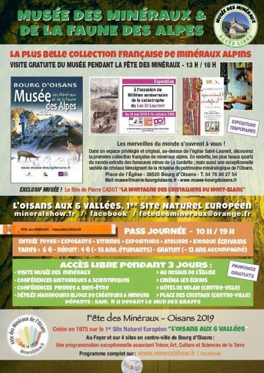 La fête et bourse des minéraux et bijoux de l'Oisans 2019 a lieu le week-end du 1er mai à Bourg d'Oisans dans l'Isère, du vendredi  3 au dimanche 5 mai, de 10h00 à 19h00.