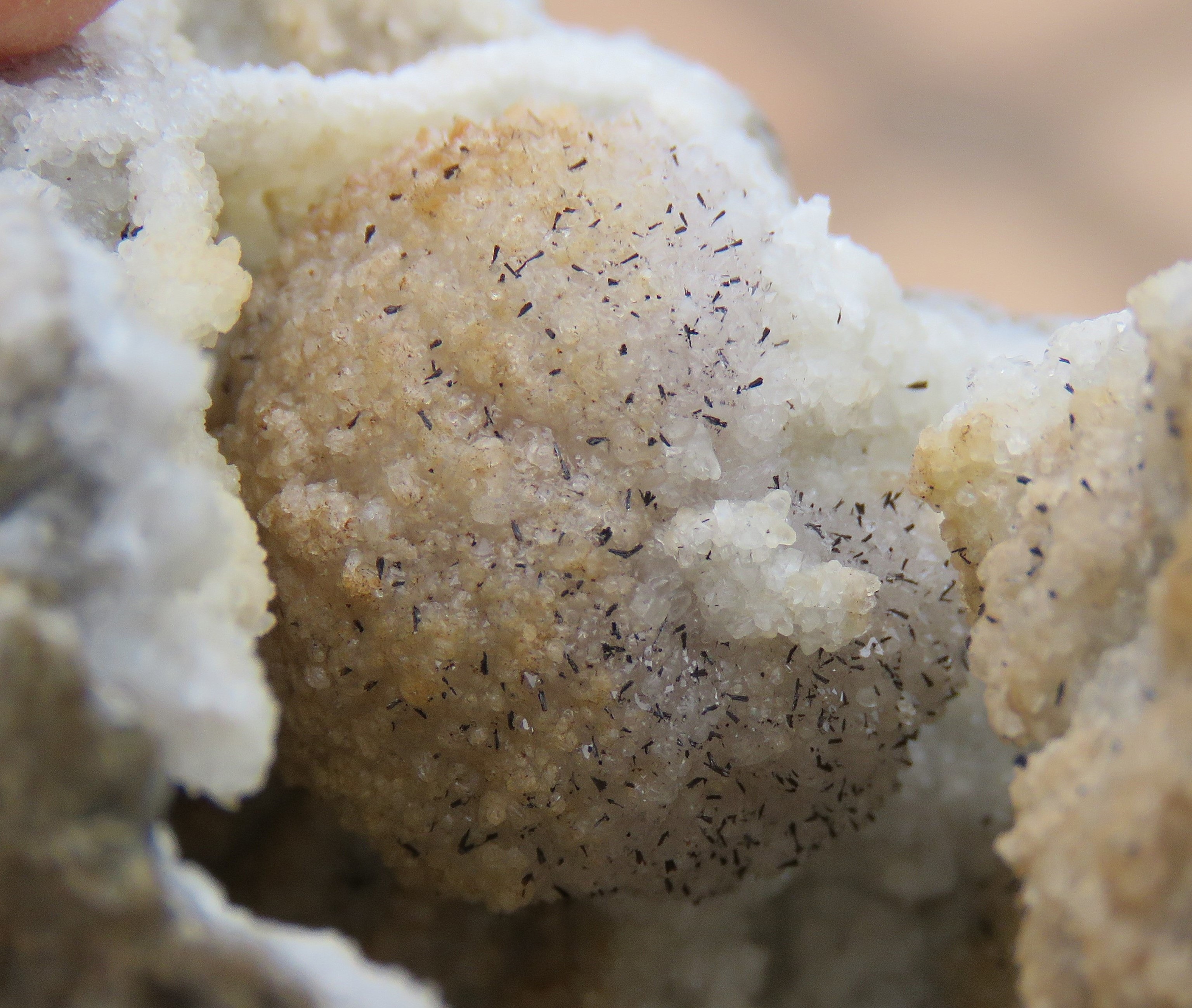 Oui, les aiguilles de goethite sont assez fréquentes, parfois en petits éventails. Malheureusement je ne suis pas équipée pour la macro-photo.
