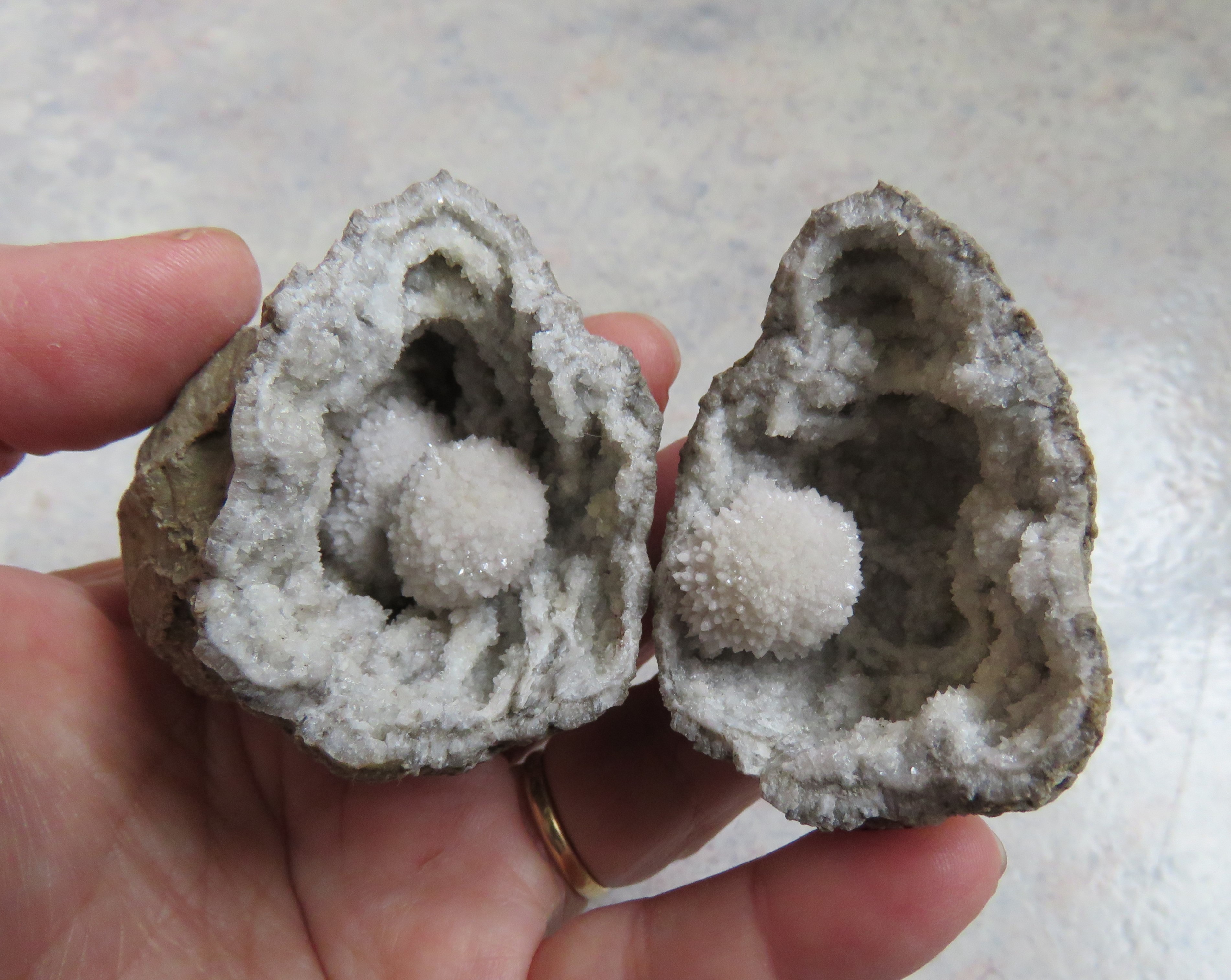 Très bien, je pensais de bien plus longtemps, dans certaines géode, sur les quartz, il peut y avoir de minuscules aiguilles de goethite, et bien plus rare de la baryte ou celestite en tablette bleutée, pas eu d'analyses.