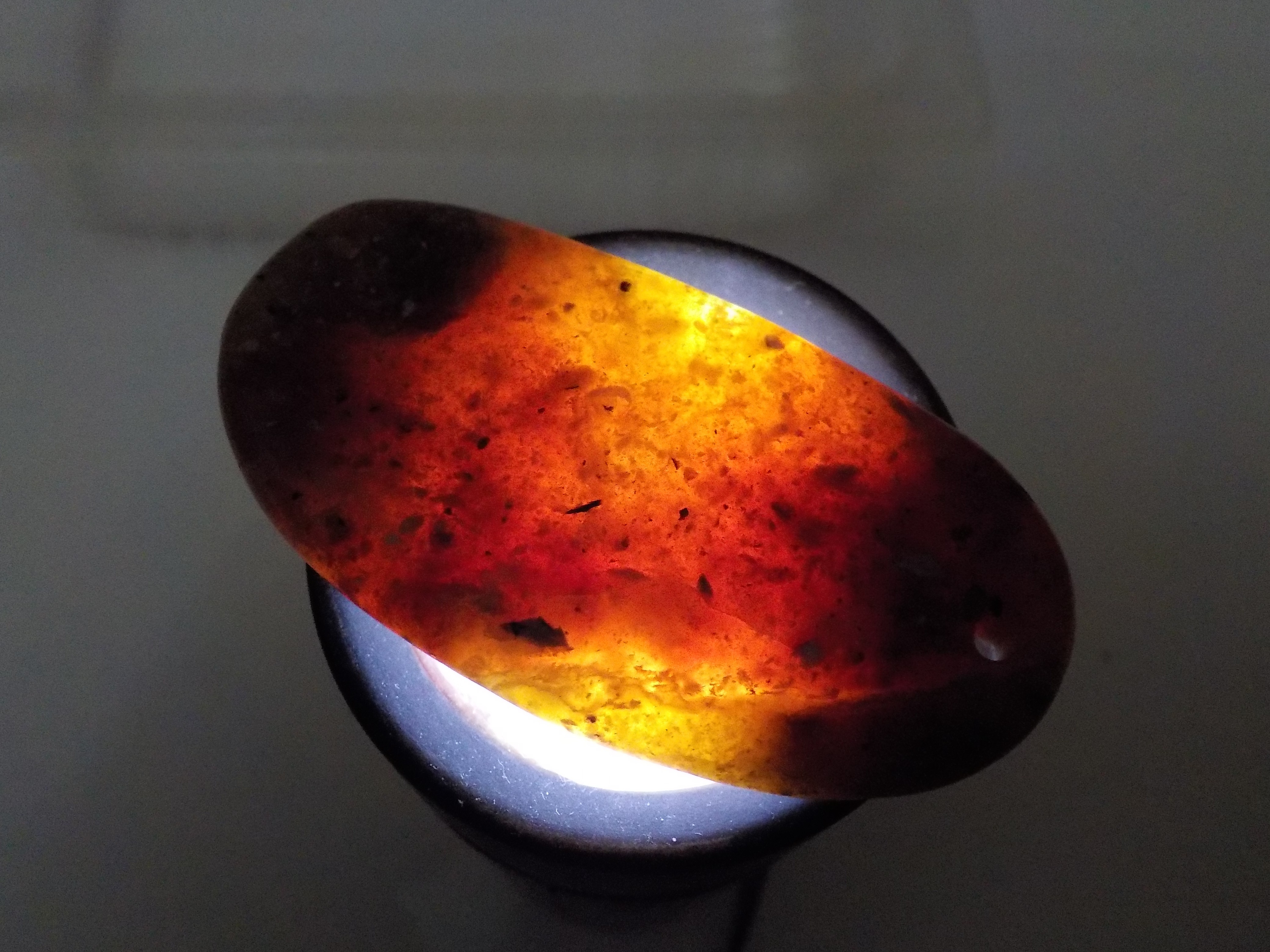 Il a pris un poli comme le font les pierres plus dures que le verre que j'ai déjà fait (quartz...), je crois, puisque j'arrivais pas à obtenir çà avec des pierres moins dures que le verre. ( je fais tourner dans du verre pilé à la fin; peut être çà à un lien avec la dureté, le fait que çà marche ou pas ?)