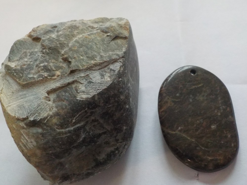 Puis j'ai remarqué que mouillé, il était assez luisant (photo). J'ai donc fait un petit passage au tonneau d'une tranche découpée à la meuleuse dans le bloc, ce qui explique le caillou de droite (puis percé, tant qu'à faire, après le tonneau, comme on peut le voir).