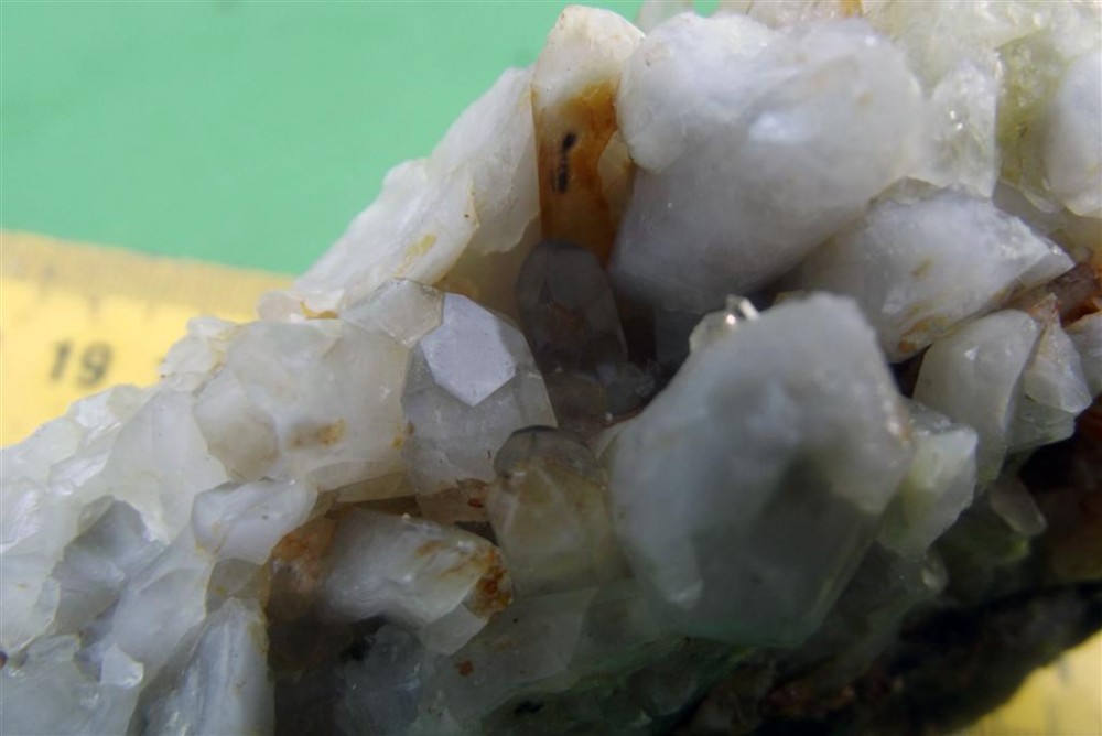 Et deux blocs de quartz. L'un à des cristaux carrément transparents (1ères photos) et l'autre (deux dernières photos) me semble recouvert de chlorite vraiment très épaisse (<- c'est pas courant à ce point par ici je crois?):