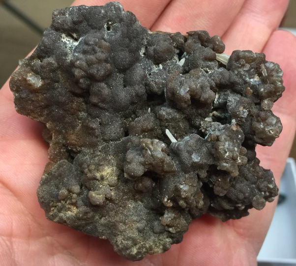 Pyromorphite brune réniforme supportant quelques baguettes de Cérusite et par place un film blanc (Anglésite ?? comme dans une analyse récente sur d'autres faciès de Pyromorphite)  [80mm]