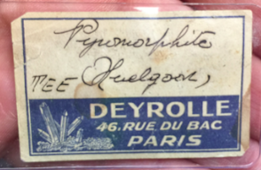 De la coll. Vésigné pour un prix de "TEE" ; au dos de Fouilhoux en juin 1938 pour 90 francs ce qui est énorme, de l'ordre de 5000 euros. Ce qui montre que l'augmentation décriée du prix des minéraux est parfois à relativiser.