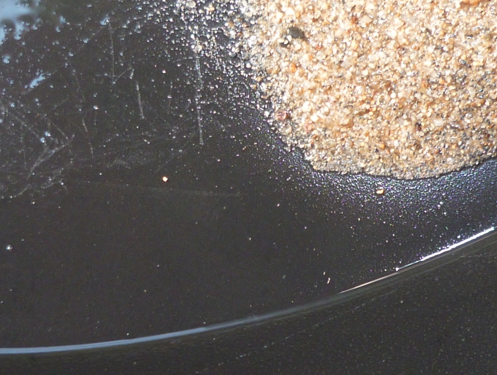 Un sable noir riche en grenats roses/rouges, très peu de magnétite, beaucoup d'ilménite. Mais le plus sympa, un peu d'or et de la belle anatase brune, grisâtre ou bleue.