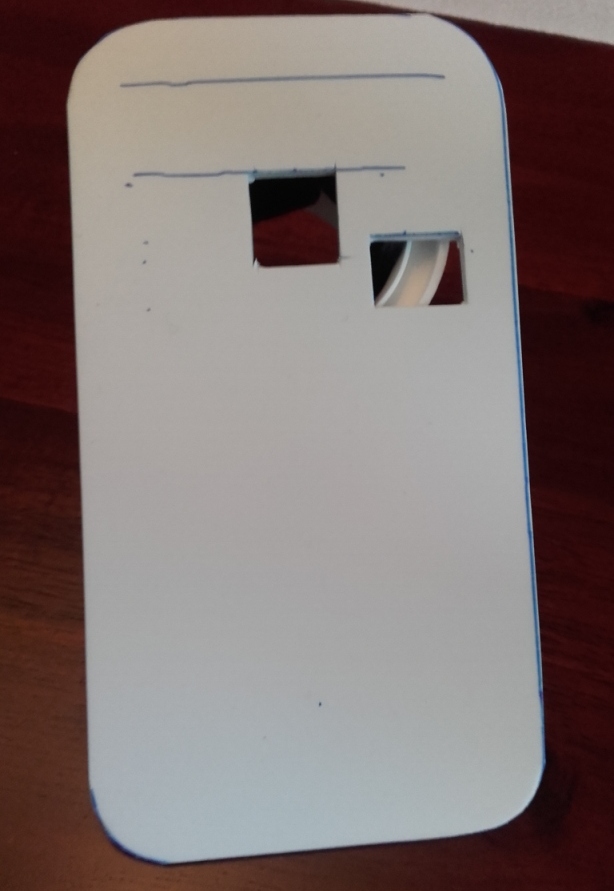 Dans une petite plaque (ici du PVC de 1.5 mm), j'ai dessiné et découpé le format du smartphone, avec l'orifice de l'appareil photo (au centre).