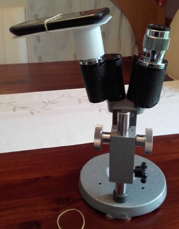 Ensuite, il me suffit de maintenir le smartphone avec un élastique (ou plusieurs) pour obtenir un positionnement (presque) parfait, mais surtout sans mouvement. Quelques réglages sont nécessaires (écart entre les deux optiques, appareil et bino, par exemple), mais une fois que tout est OK, je peux même faire ma mise au point en regardant directement l'écran. L'appareil étant bien maintenu, j'évite le "coup de doigt" au moment du déclenchement et un flou parasite.
