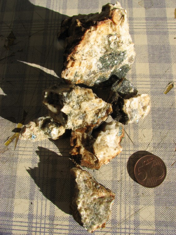 Certain que lorsque le soleil tape, les pieds au frais c'est plus agréable, et avec une bonne bouteille de rosé, le top, après quelques verres, tu multiplies les paillettes, pouvez-vous me donner votre avis sur ce minéral trouvé il y a quelques temps dans la carrière de St Pierre Montlimard ,, il y a de la dolomie rose (non visible sur la photo), de la pyrite, du quartz, et des cristaux en baguettes légèrement translucides avec une âme blanchâtre, taille 5mm, célestine ?
