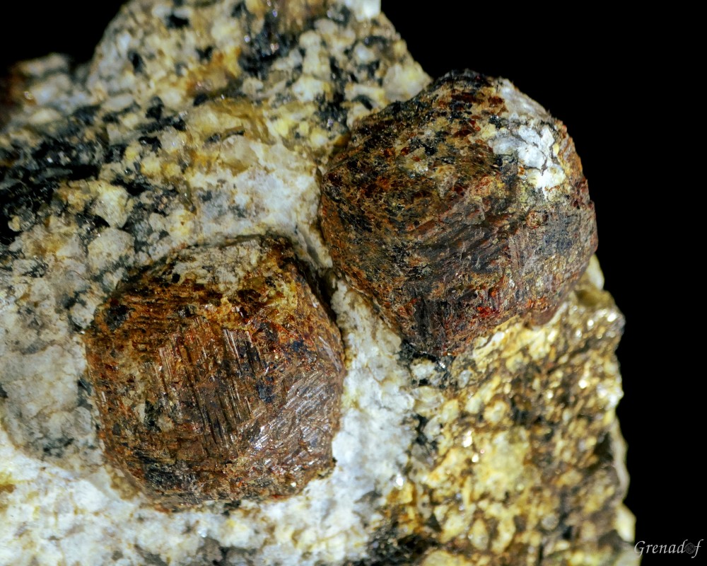 Contribution avec des Almandins de Plouguerneau, une cristallisation bien particulière, car l'on observe les stries de croissances sur les facettes rhomboèdriques, non sans rappeler les fameux "etched" Pakistanais, en moins gemme. Les grenats font 2.1cm et sont dans un granite bien coriace, surtout avec mon petit compresseur de poche lol.