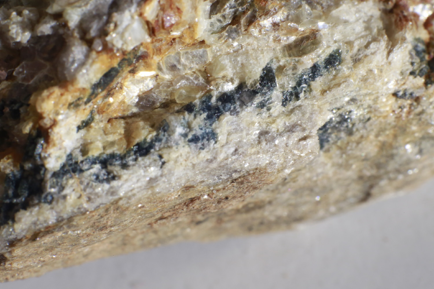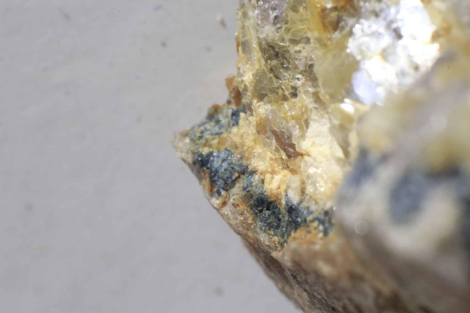 On passe à la couleur ;) pas très loin du site précédent j'ai trouvé des pegmatites présentant à la jonction avec le micaschiste un encroutement bleu (je n'ai pas encore réalisé de test ^^')