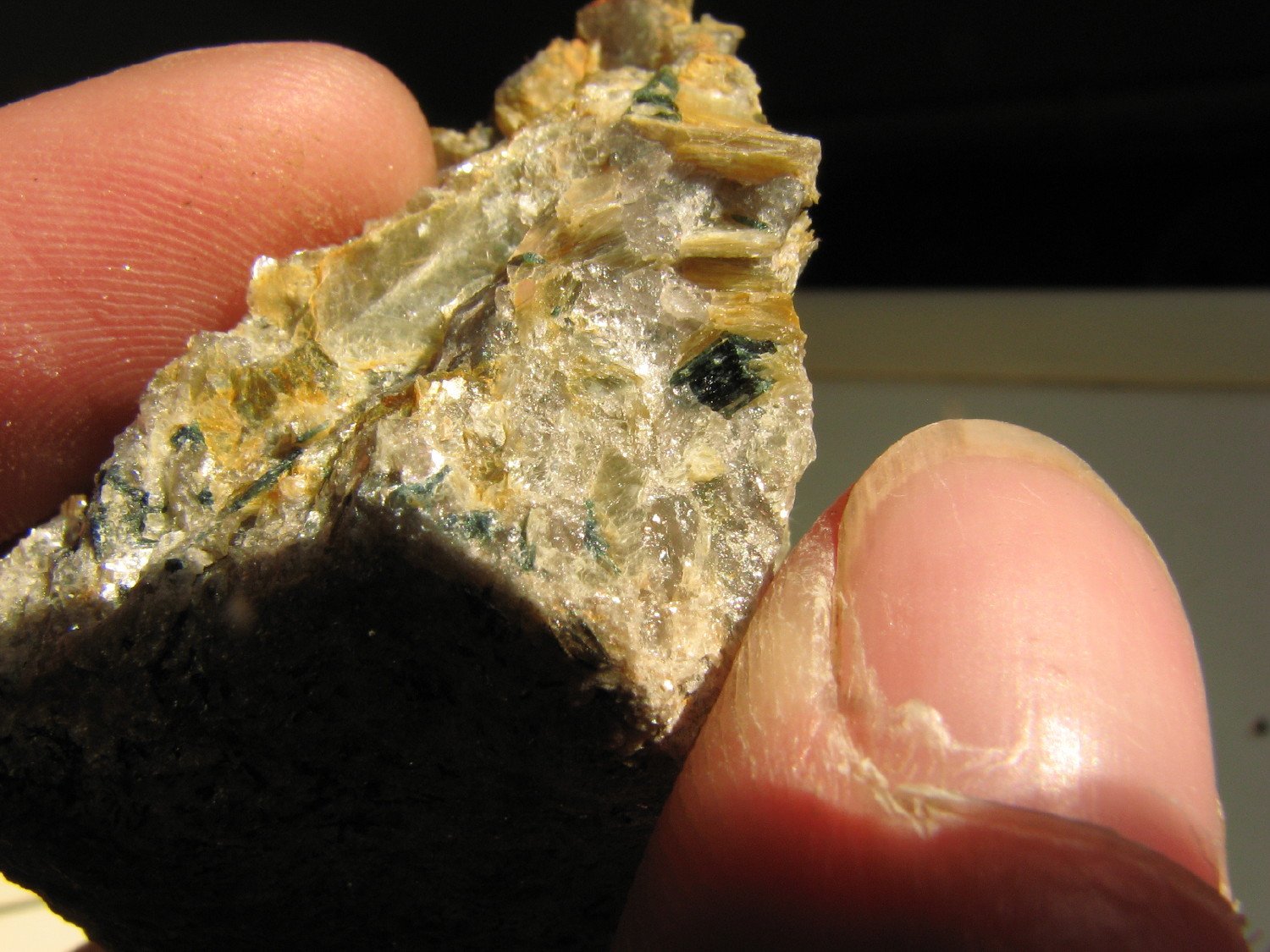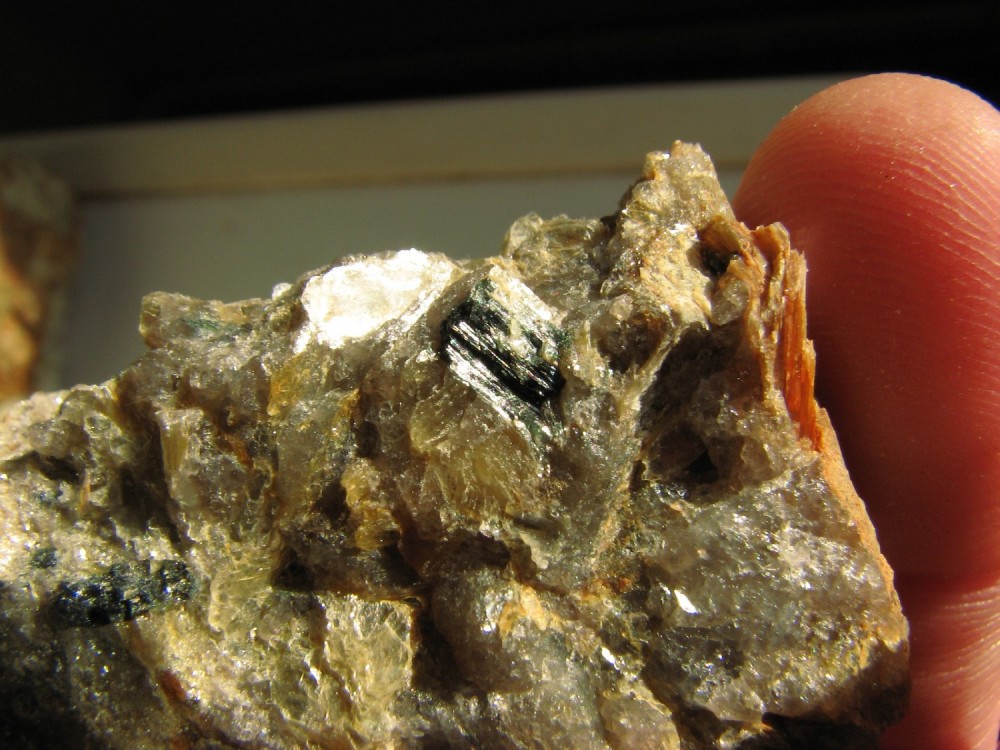 J'y ai trouvé de très belles tourmalines et petits béryls, certaines sont prises dans un encroutement de biotite très esthétique :)