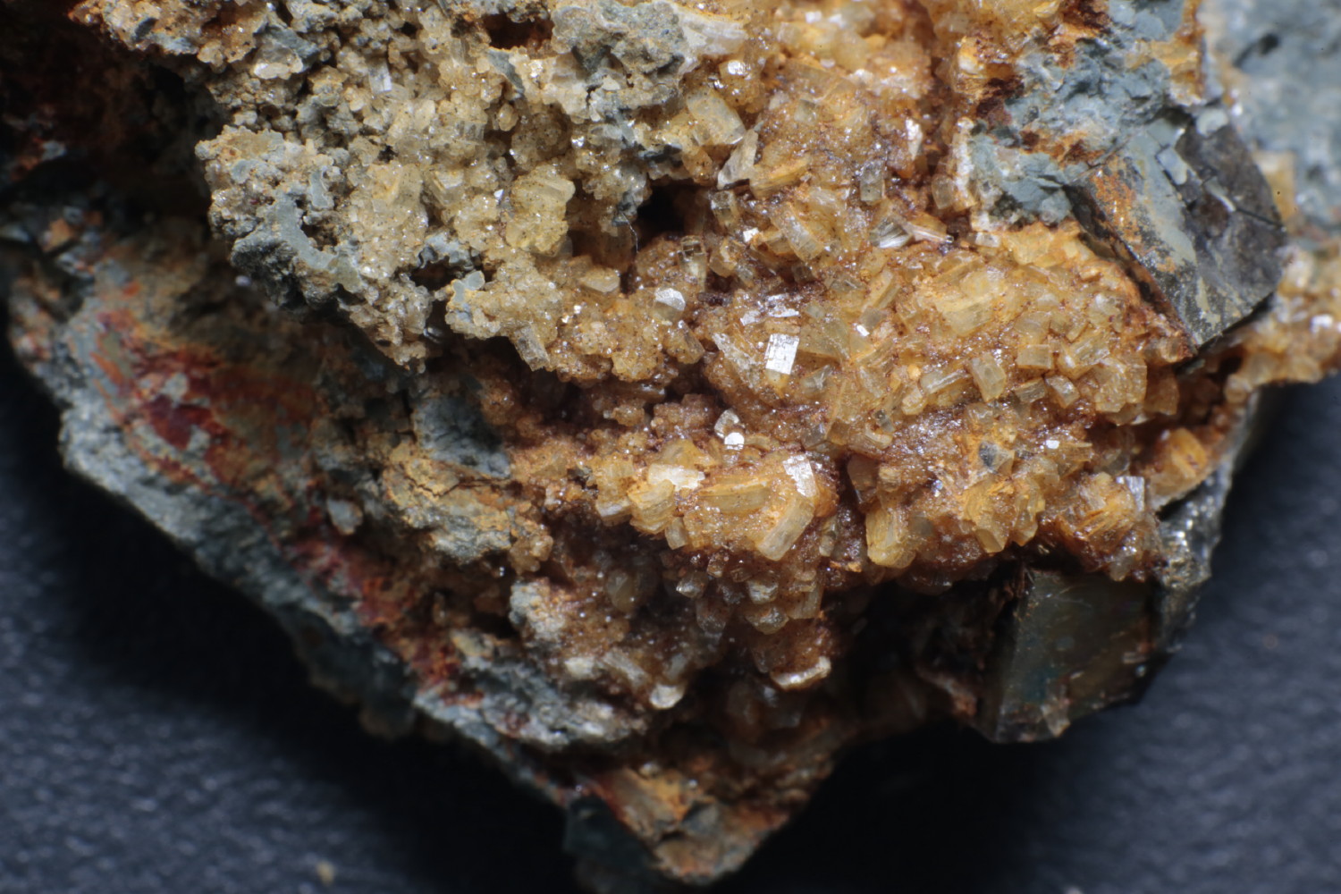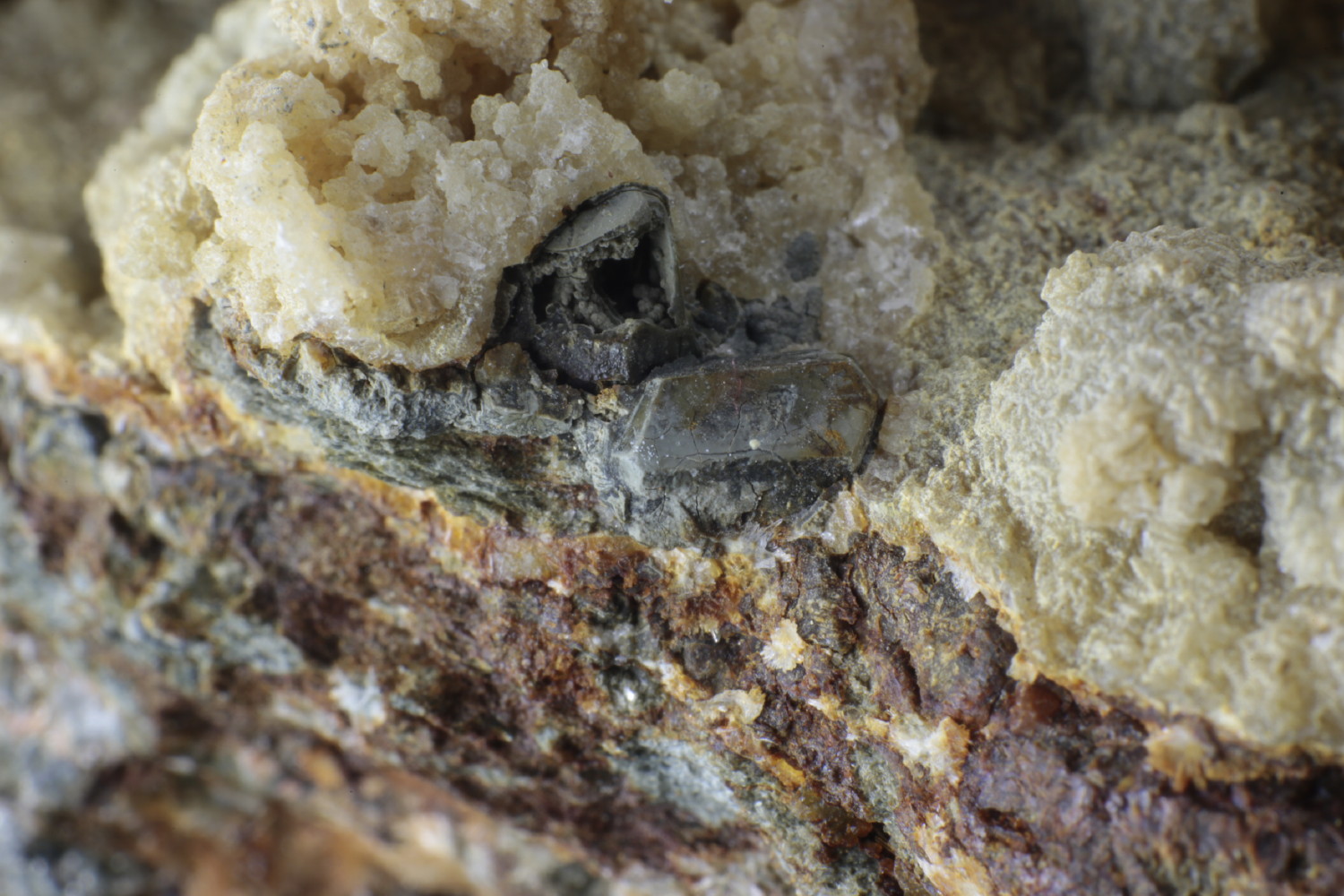 Bromyrite (avec Cl) en cristaux inframillimétriques dans une géode tapissée de "terre rouge" (60mm)