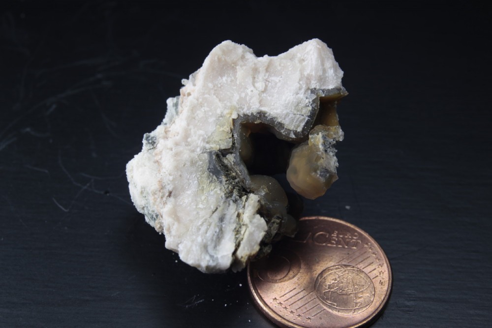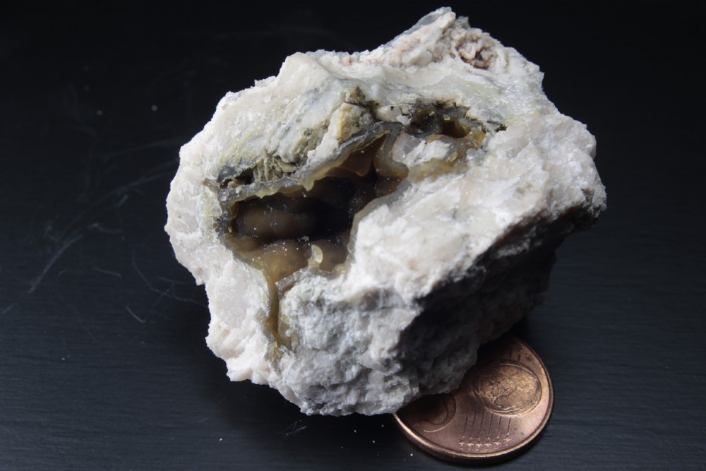 - Celle-ci à une couche blanche, grasse et brillante comme de l'opale, mais ça doit être de la calcédoine ;)
