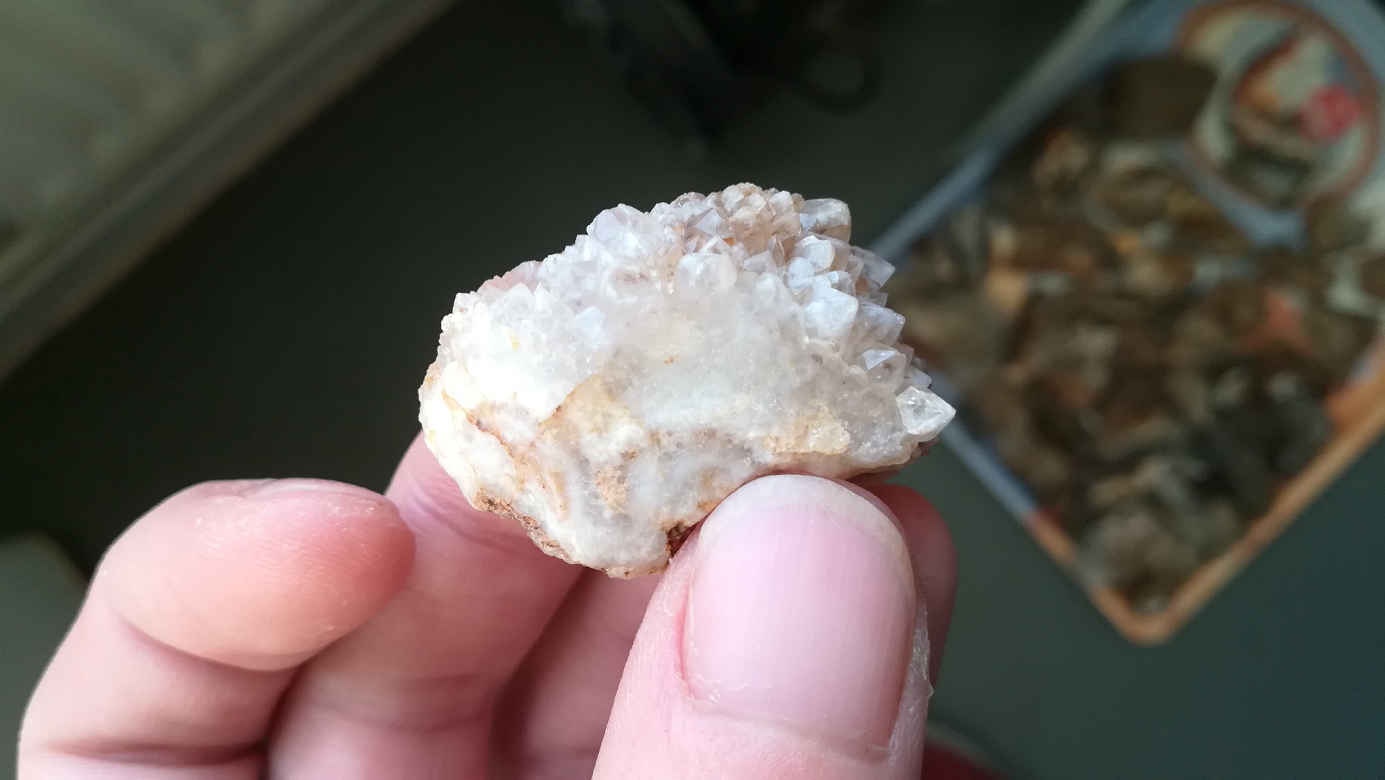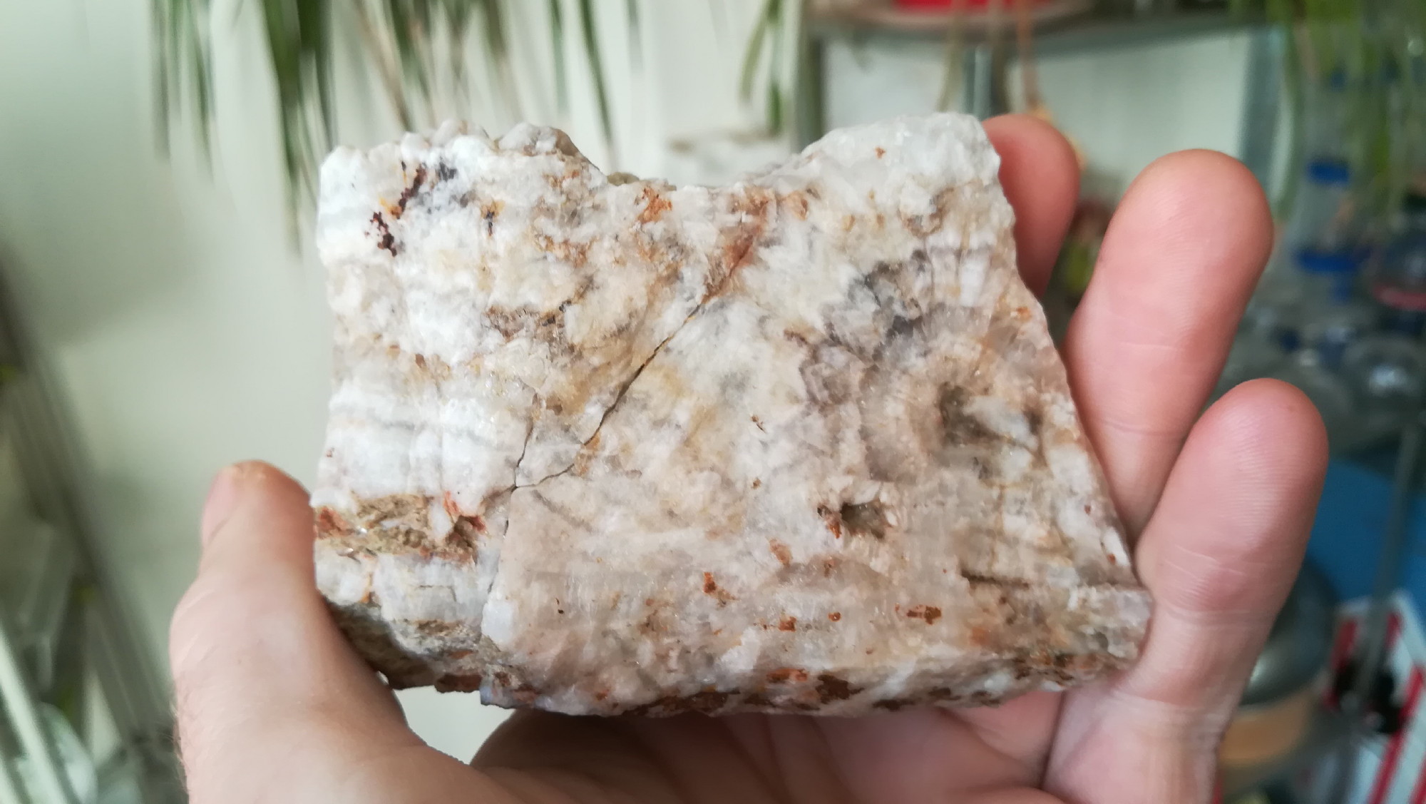En regardant de plus pret le gros bloc de quartz plein de veine cristallisée pour décider de son avenir (mais je sais pas trop dans quel sens le casser pour avoir un résultat optimal... les "veines" étant un peu partout