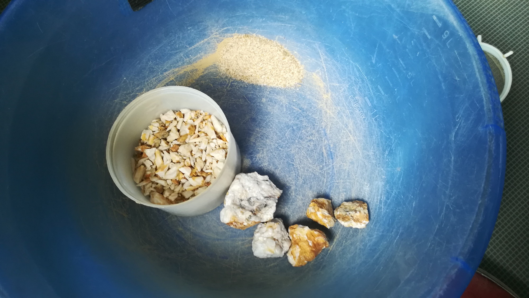 Je me suis amusé à broyer le bloc de quartz qui entourait le flottant présenté dans mon post précédent (pas les cristaux bien sûr ;)) histoire de voir ce qu'on pouvait trouver dans le filon ^^
