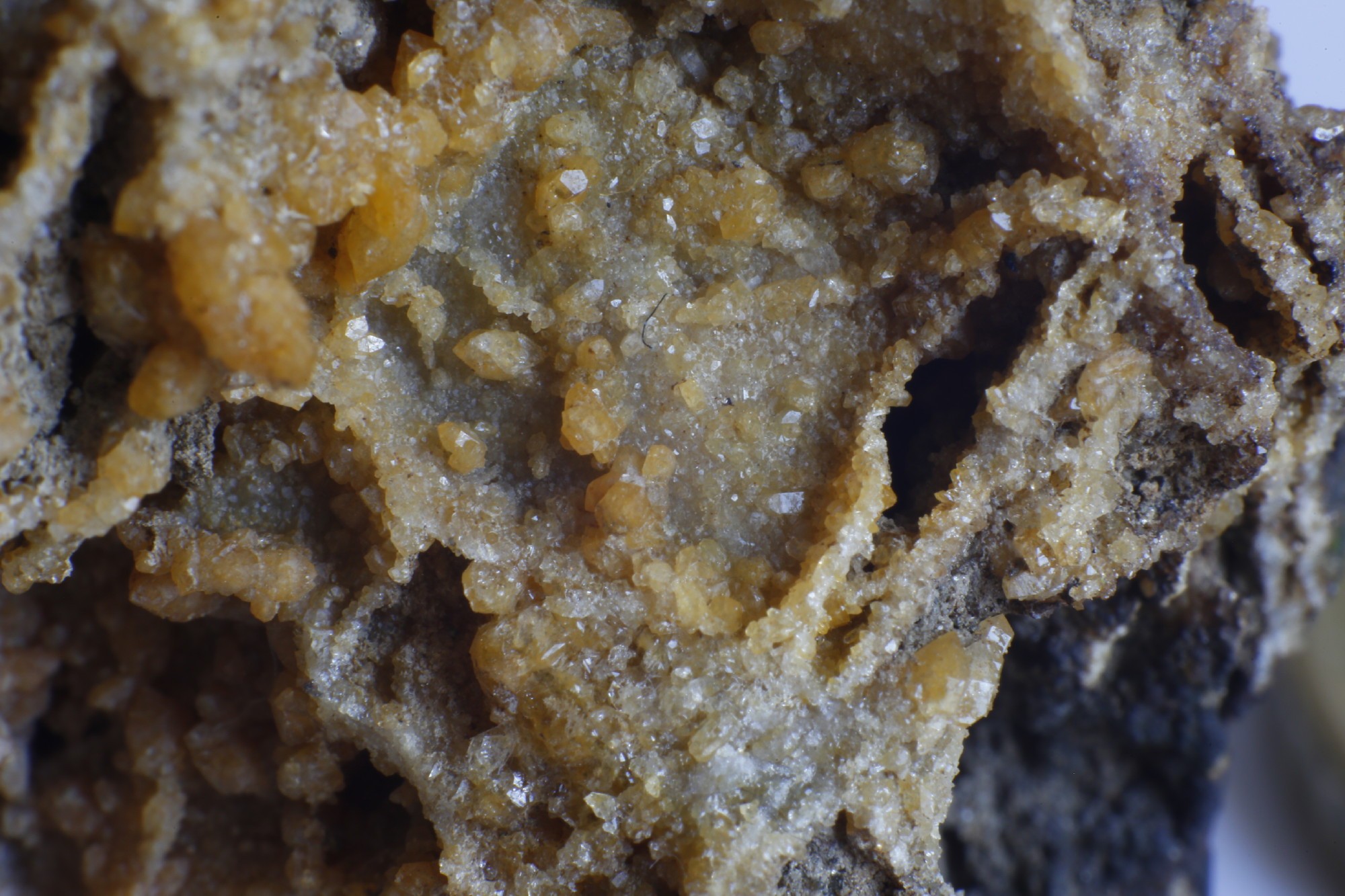 en petits cubes (micro) éparses, puis en plaquages plus conséquents, j'avoue ne pas savoir si il s'agit de dolomite et/ou de calcite.