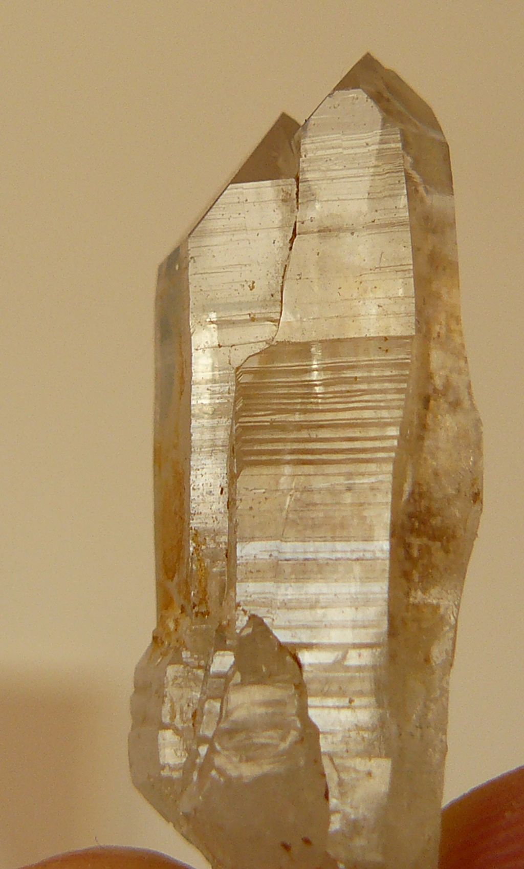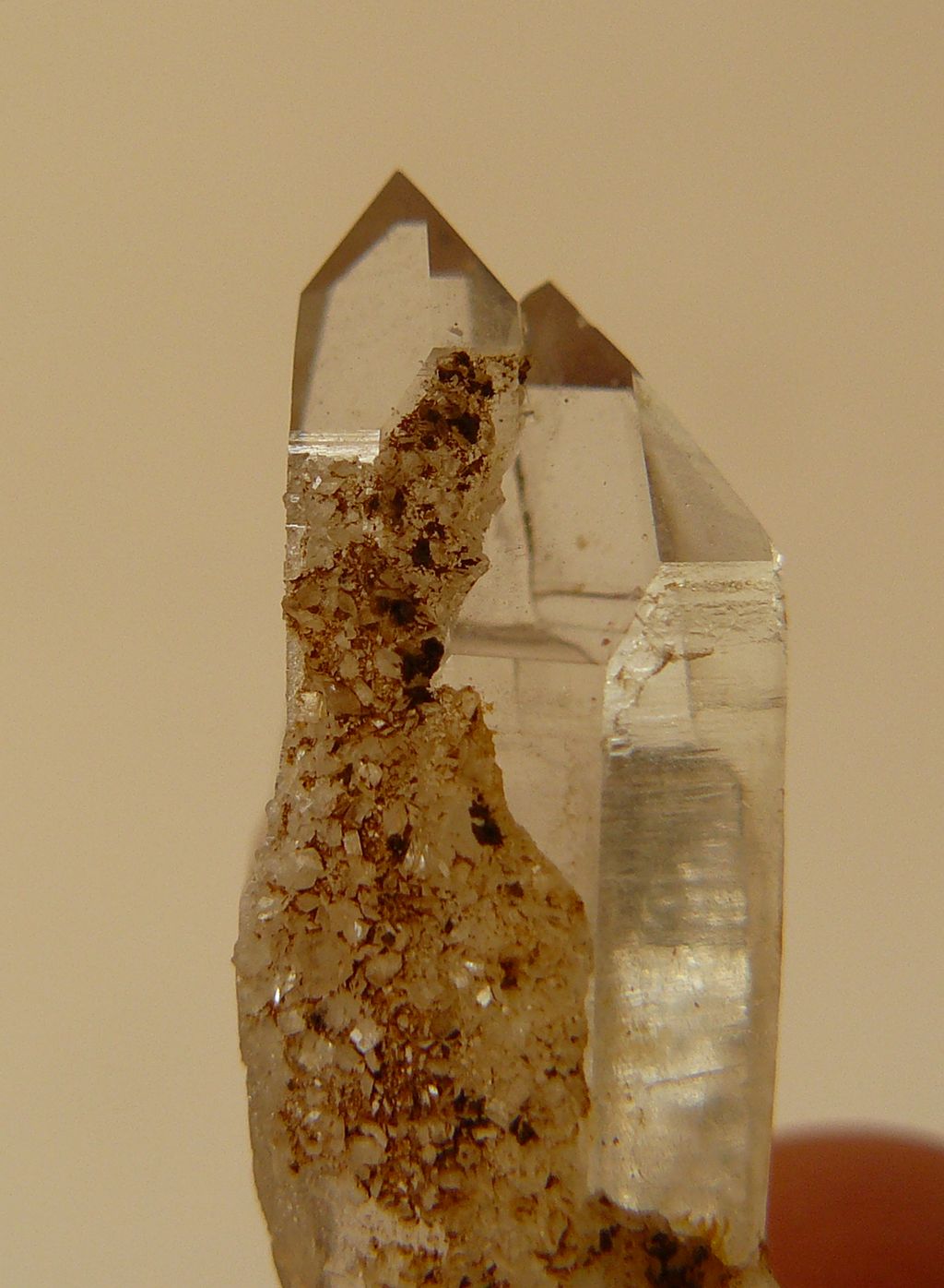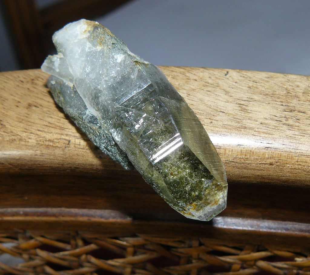 "Mais entendons-nous bien. Il ne s'agit pas ici de briller en présentant des pièces très esthétiques, ni de montrer des raretés nationales, mais de montrer des curiosités ou des pierres peu fréquentes de Bretagne, c'est tout. En présentant ci-dessous des quartz chloriteux, il y a de quoi pouffer de rire en les voyant. Le moindre débutant, dans les alpes par exemple, en trouve de plus beaux et ne les ramasse pas. Certes, mais encore une fois, le quartz transparent en association avec la chlorite n'est pas spécialement fréquent chez nous. idem pour le biterminé exposé ci-dessus qui n'a rien que de très banal pour un savoyard mais pour un breton, c'est plutôt sympa. Si je dis des inepties, reprenez-moi !"