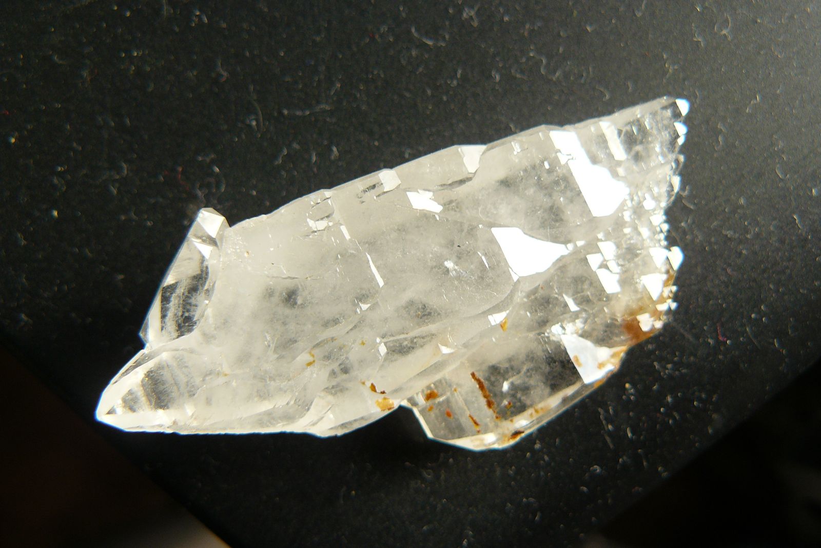 Mais entendons-nous bien. Il ne s'agit pas ici de briller en présentant des pièces très esthétiques, ni de montrer des raretés nationales, mais de montrer des curiosités ou des pierres peu fréquentes de Bretagne, c'est tout. En présentant ci-dessous des quartz chloriteux, il y a de quoi pouffer de rire en les voyant. Le moindre débutant, dans les alpes par exemple, en trouve de plus beaux et ne les ramasse pas. Certes, mais encore une fois, le quartz transparent en association avec la chlorite n'est pas spécialement fréquent chez nous. idem pour le biterminé exposé ci-dessus qui n'a rien que de très banal pour un savoyard mais pour un breton, c'est plutôt sympa. Si je dis des inepties, reprenez-moi !