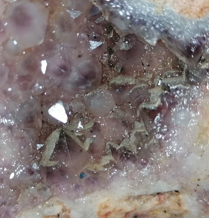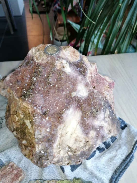 En prenant une photo de la petite géode juste en bas à droite de la pièce de 2 euros, je me suis aperçu de la présence d'une marque bleue en bas de la géode, centre de la photo: