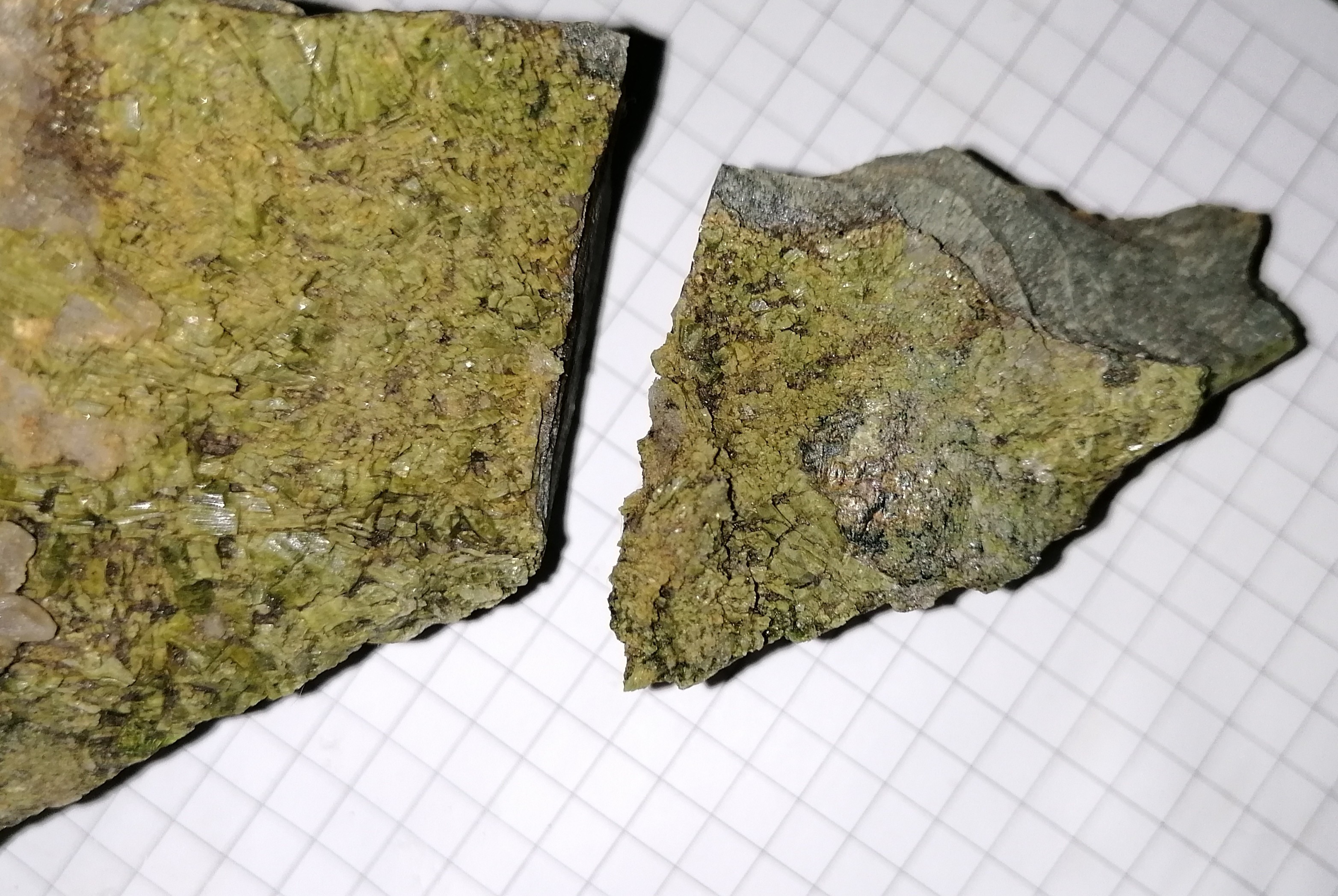 - un placage d'épidote avec quelques microcristaux. La pièce c'est malheureusement cassée en deux.